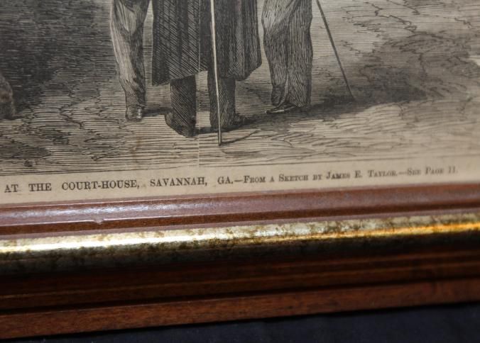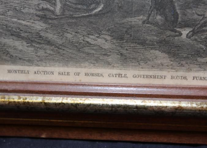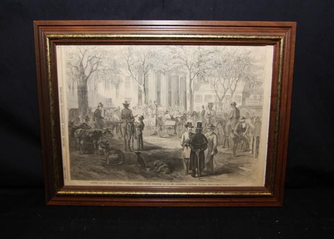 FR PRINT, 1867, FROM FRANK LESLIE'S ILLUSTRATED NEWSPAPER. "MONTHLY AUCTION SALE OF HORSES, CATTLE, GOVERNMENT BONDS, FURNITURE, ETC. AT THE COURT-HOUSE, SAVANNAH, GA - FROM A SKETCH BY JAMES E. TAYLOR" 18" X 12 3/4"Created By