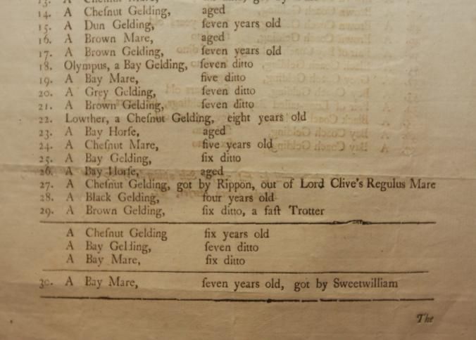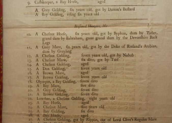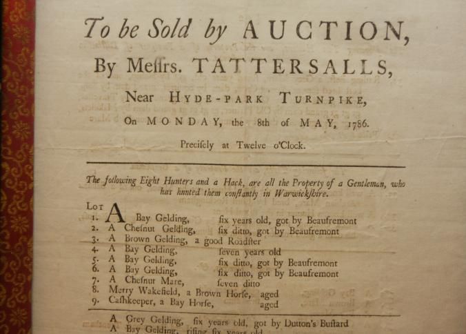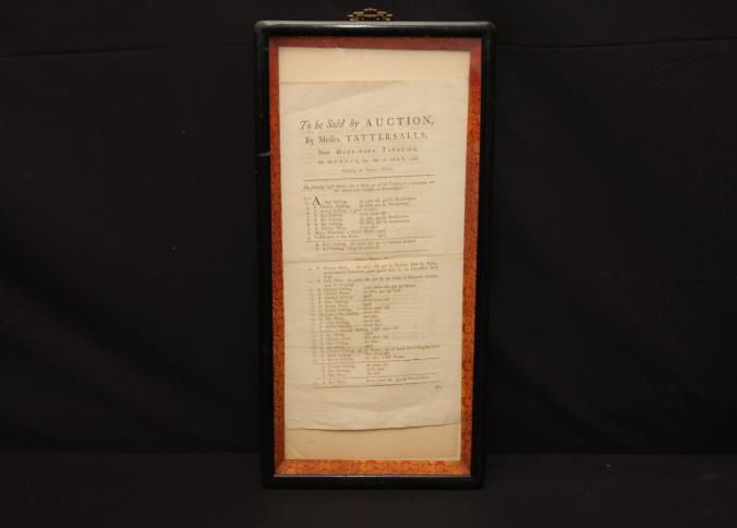 FR CAT, HORSE, 1786, ENGLAND. TO BE SOLD BY AUCTION BY MESSRS. TATTERSALLS. 10 1/2" X 20"