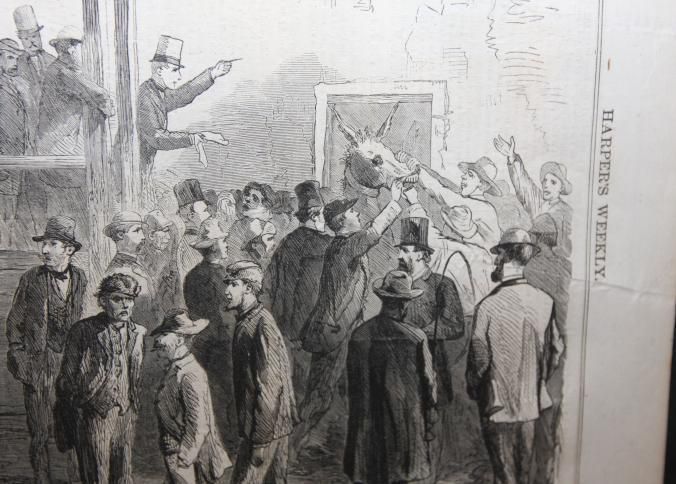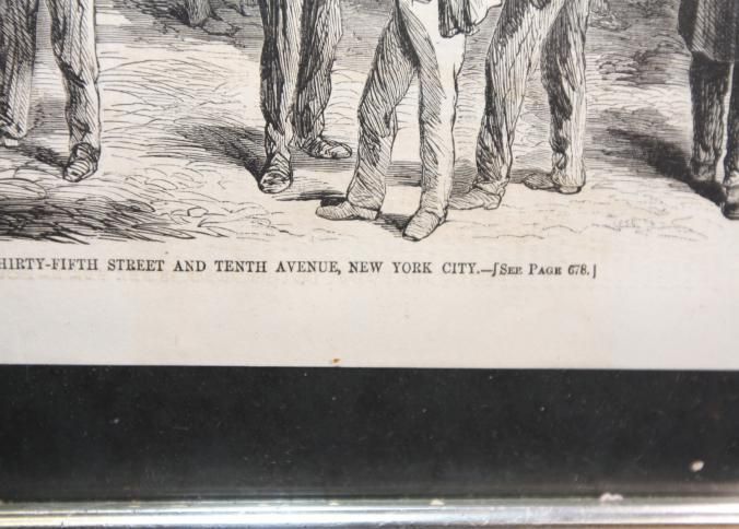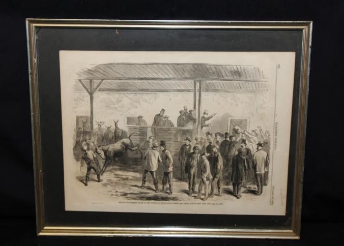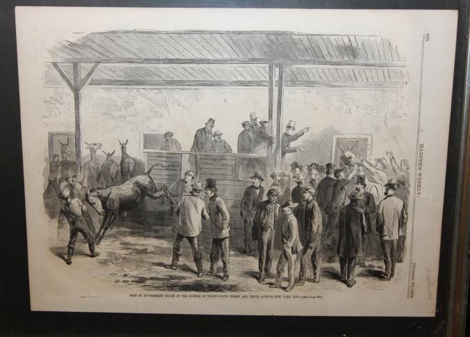 FR PRINT, 1865, NY. PRINT FROM HARPERS WEEKLY, "SALE OF GOVERNMENT MULES AT THE CORNER OF THIRTY-FIFTH STREET AND TENTH AVENUE, NEW YORK CITY. 18 3/4" X 14 1/4"Created By