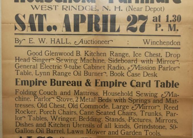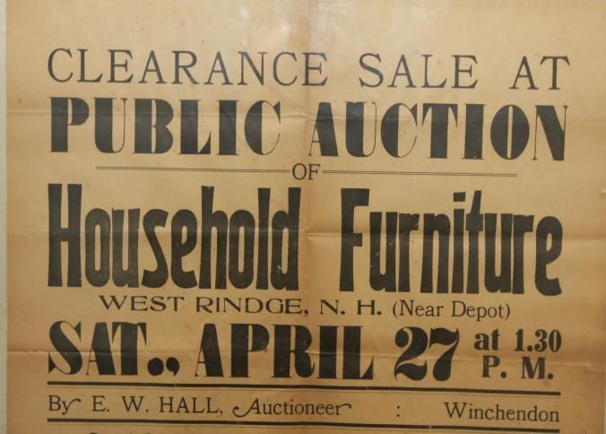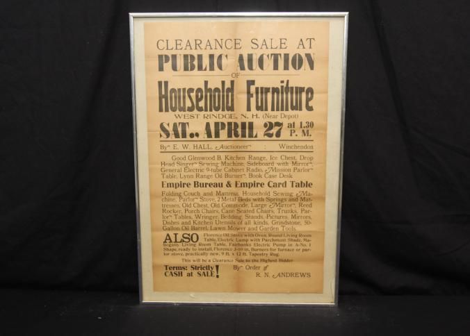 FR BROADSIDE, FURNITURE, NH. CLEARANCE SALE AT PUBLIC AUCTION OF HOUSEHOLD FURNITURE BY E.W. HALL, AUCTIONEER. 18 1/4" X 24 1/4"Created By