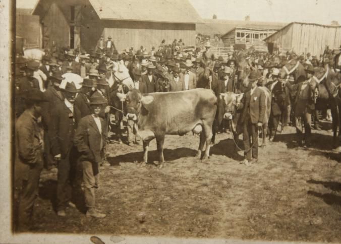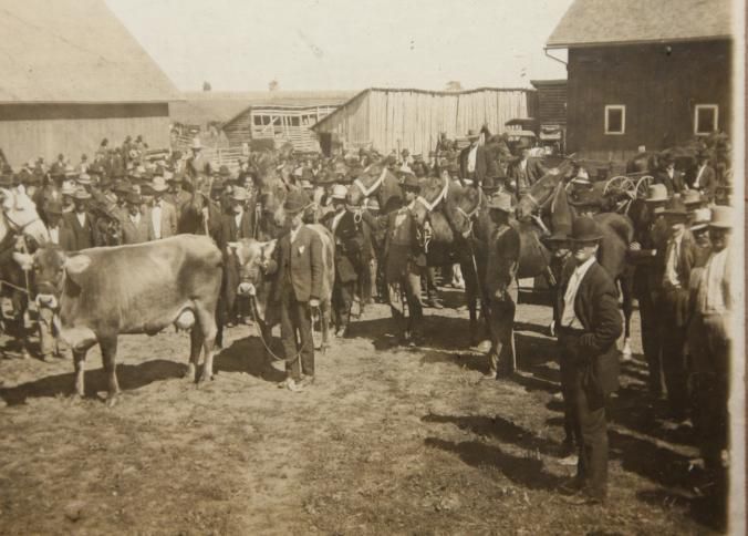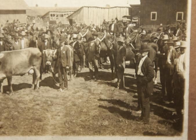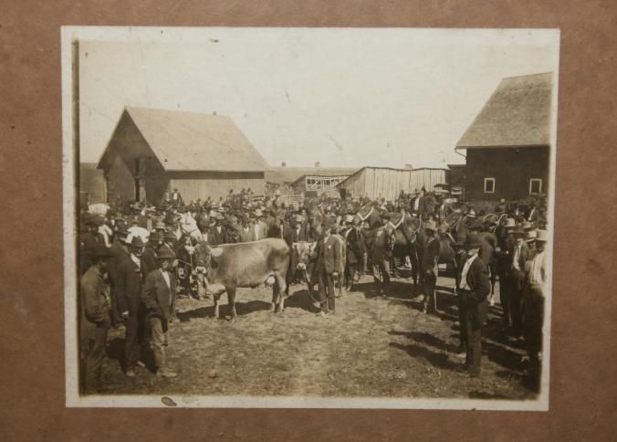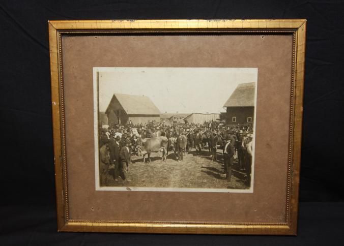FR. 19THC FARM AUCTION PHOTO. 5X7". MOUNTED ON CARDBOARD THE SCENE SHOWS A LARGE CROWD AND COWS WITH BARNS AND OUTBUILDINGS.Created By