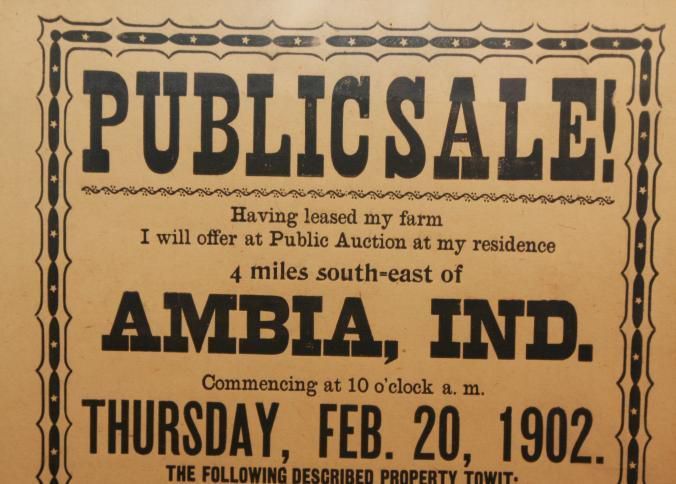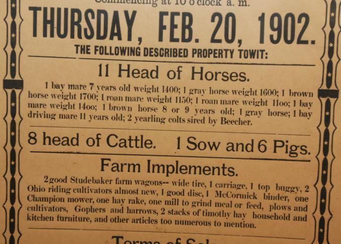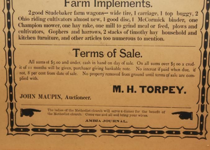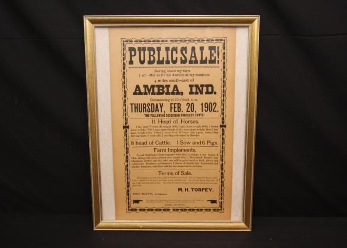 FR BROADSIDE, 1902, LIVESTOCK, IN. PUBLIC SALE! 11 HEAD HORSES, 8 HEAD CATTLE, 1 SOW, 6 PIGS, IMPLEMENTS. JOHN MAUPIN, AUCTIONEER. 17 1/2" X 21 1/2"Created By