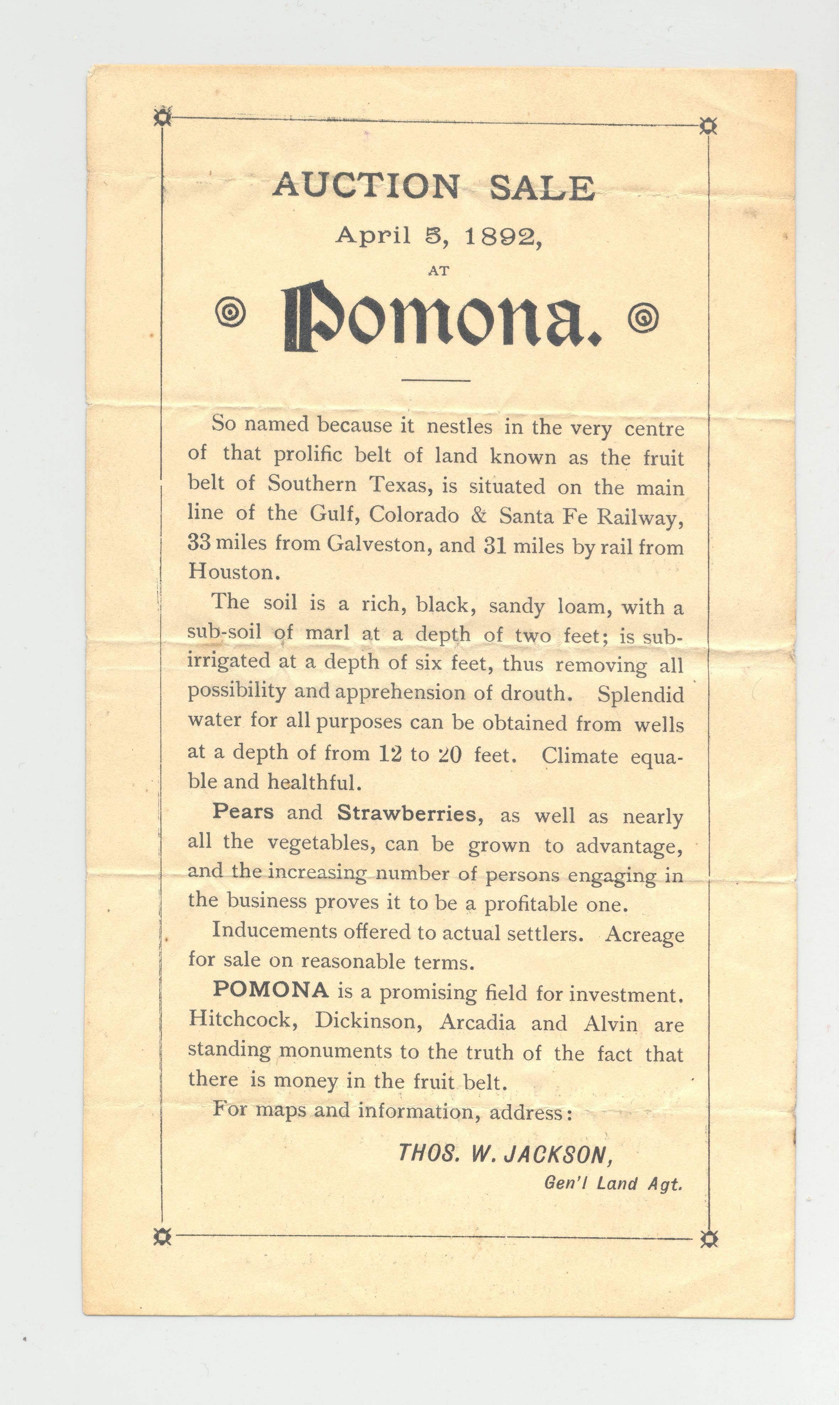 SMALL AUCTION AD, FARM, 1892, TX. AUCTION SALE AT POMONA. THOS. W. JACKSON, GEN'L LAND AGT. 3 1/4" X 6"Created By