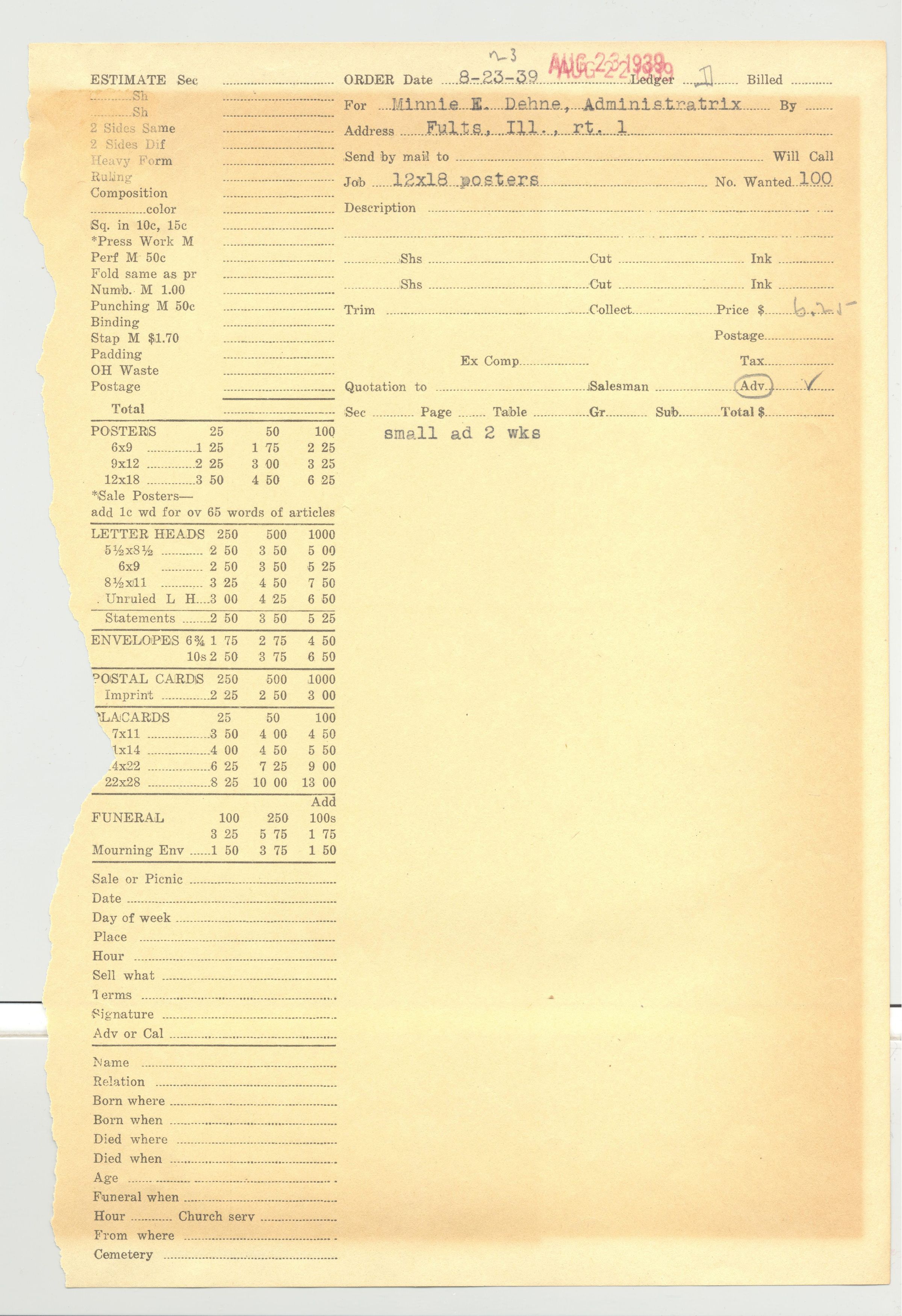 AD ORDER, 1939, FOR MINNIE DEHNE, ADMINISTRATRIX, FULTS, IL. 100 12X18 POSTERS. 7 1/2" X 11"