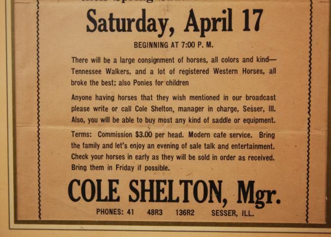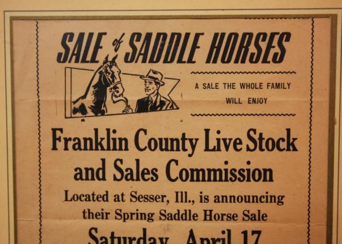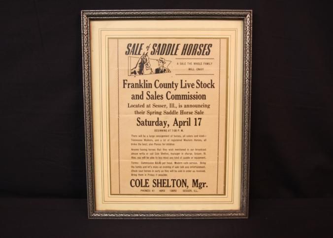 FR. 20THC "SALE OF SADDLE HORSES". 8X9 1/2". VIGNETTE OF MAN WITH HORSE IN TOP LEFT. "A SALE THE WHOLE FAMILY WILL ENJOY" HELD AT FRANKLIN COUNTY LIVESTOCK AND SALES COMMISSION SESSER, ILL. SPRING AUCTION SAT. APRIL 17TH 7PM.cOMMISSION WAS $3. A HEAD. COLE SHELTON, MGR. PHONE #41.Created By