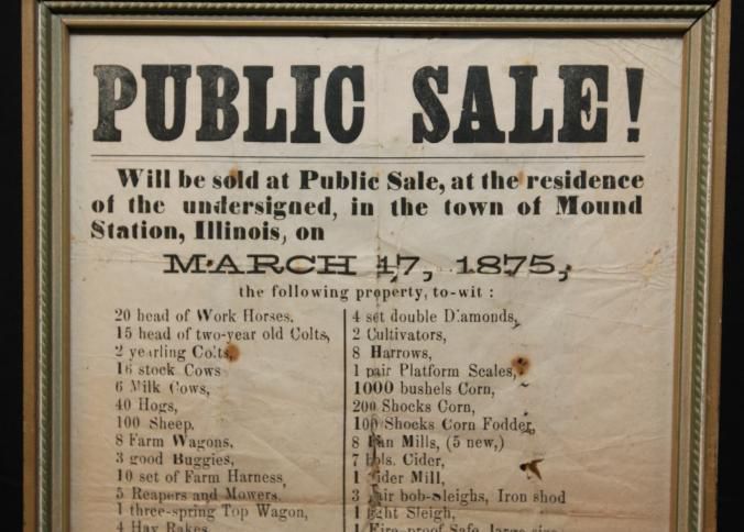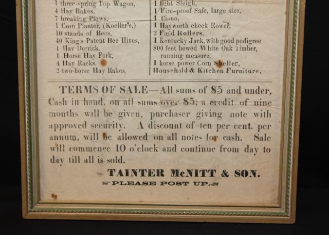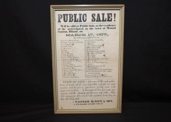 FR. 1875 ILL. FARM AUCTION BROADSIDE. 8 1/2X12 1/2". AUCTIONEERS "TAINTER MC NITT & SON" OFFERED A SUBSTANTIAL LISTING OF LIVESTOCK, WAGONS, BUGGIES, EQUIPMENT, TIMBER AND CROPS AT AUCTION IN THE TOWN OF MOUND STATION, ILLINOIS ON MARCH 17TH AT 10AM TO CONTINUE DAY TO DAY UNTIL ALL IS SOLD.Created By