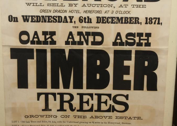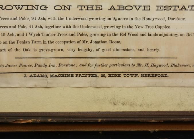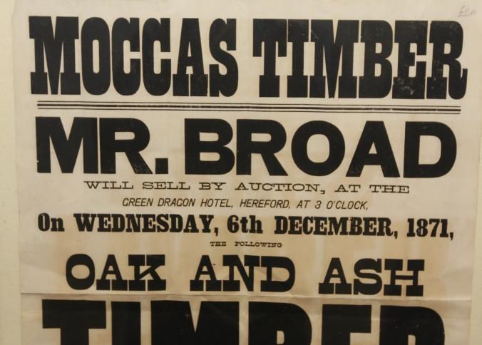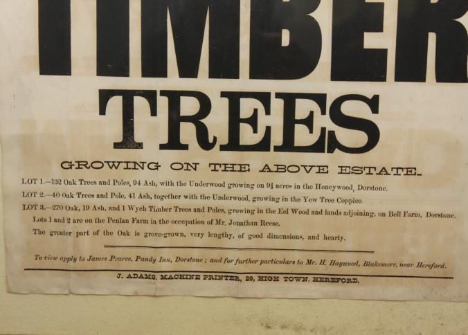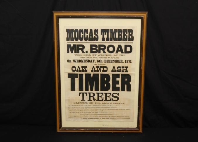 FR. 1871 "MOCCAS TIMBER TREES" BROADSIDE. 17 1/4X22". FANTASTIC ENGLISH BROADSIDE HAVING 10 DIFFERENT SIZE TYPE INVOLVED IN THE ADVERTISING OF "OAK AND ASH TIMBER TREES" BEING SOLD IN 3 LOTS FOR MR. BROAD'S ESTATE BY AUCTIONEER JAMES PEARCE AT PANDY INN. THE WORD "TIMBER" IS PRINTED IN 4" TALL LETTERS!Created By
