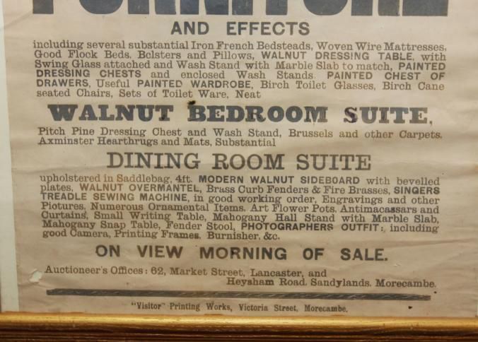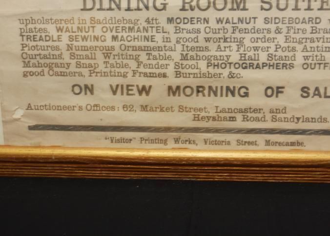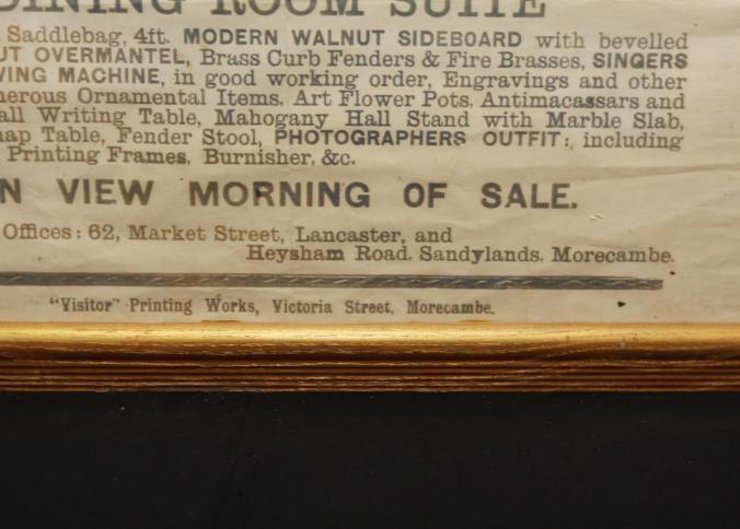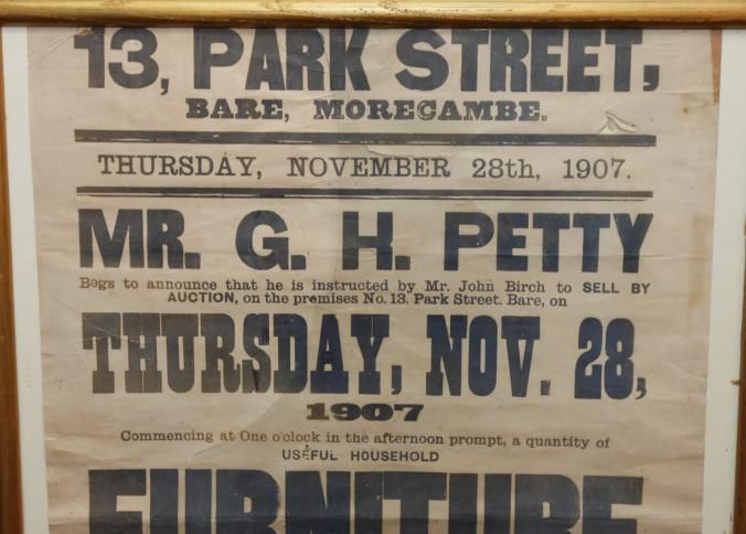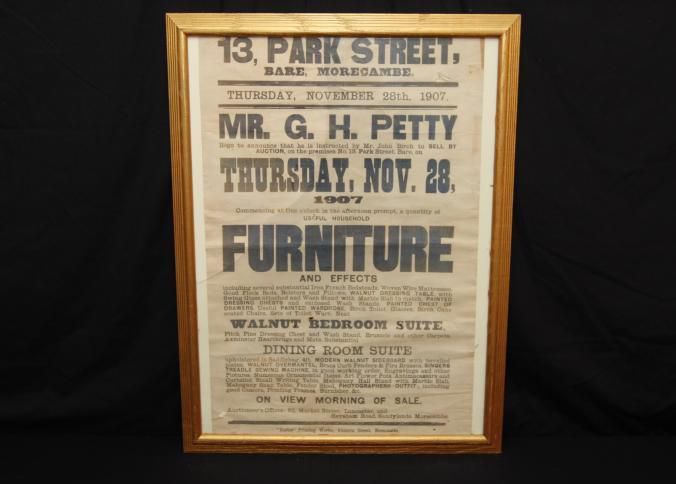 FR. 1907 CONTENTS OF HOME AUCTION BROADSIDE. 20X28". AUCTIONEER JOHN BIRCH WAS SELLING FOR G.H. PETTY THE CONTENTS OF HIS HOME AT 13 PARK ST., BARE, AT 1PM. GREAT LISTING OF FURNITURE, PHOTOGRAPHER'S OUTFIT, ENGRAVINGS, CURTAINS, ETC. AUCTIONEER'S OFFICES LOCATED #2 MARKET ST. LANCASTER.Created By