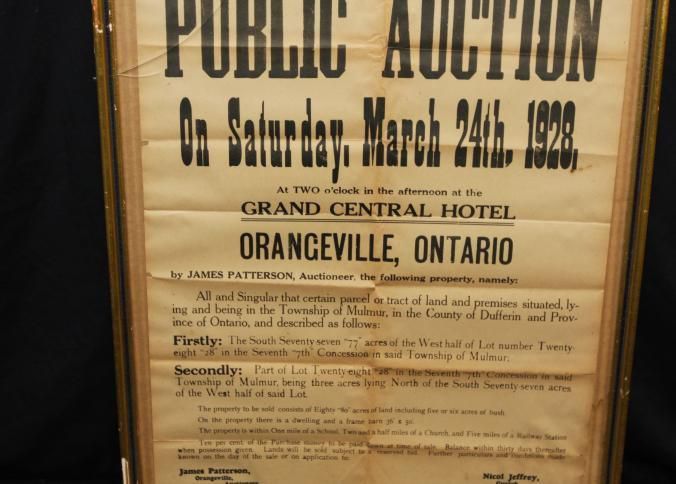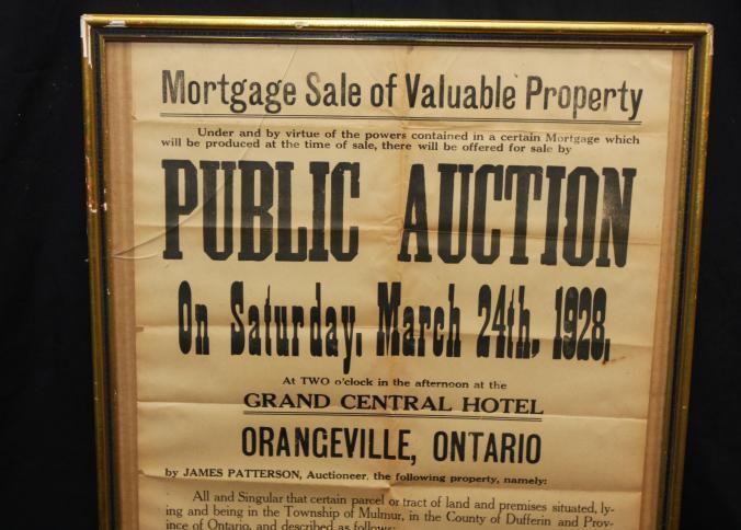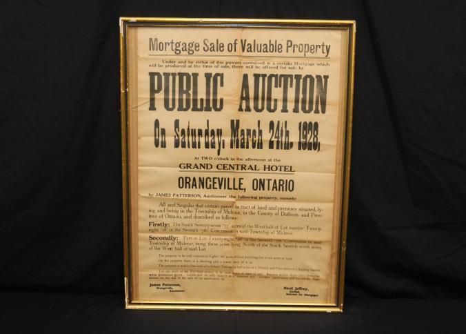 FR. 1928 CANADIAN REAL ESTATE AUCTION BROADSIDE. 18X23". AUCTIONEER JAMES PATTERSON FROM ORANGEVILLE SOLD THE GRAND CENTRAL HOTEL OF ORANGEVILLE, ONTARIO AT 2PM. GREAT DETAILED DESCRIPTION OF PROPERTY. 10% DOWN AND BALANCE IN 30 DAYS, SOLD SUBJECT TO RESERVE BID.Created By
