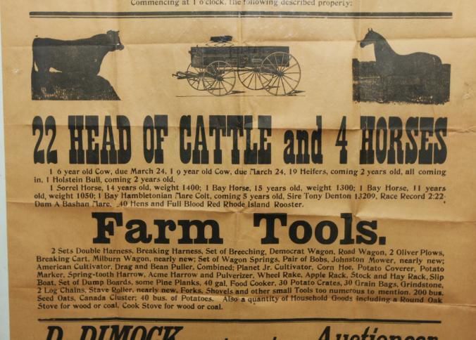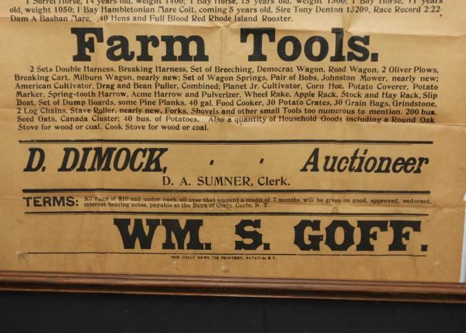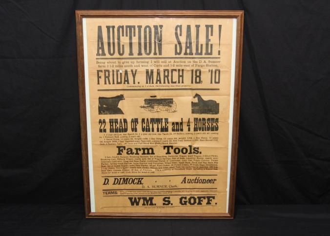 FR. 1910 NY FARM AUCTION BROADSIDE. 20X28". FANTASTIC "AUCTION SALE!" ADVERTISEMENT HAVING 3 VIGNETTES OF A COW, WAGON AND HORSE. AUCTIONEER D. DIMOCK WAS SELLING FOR WM. S. GOFF WHO DECIDED TO GIVE UP FARMING ALL THE LIVESTOCK, TOOLS, EQUIPMENT AND HOUSEHOLD ITEMS. GREAT DETAIL. A WONDERFUL, LARGE BROADSIDE. THE D.A. SUMNER FARM WAS LOCATED 3 1/2 MILES SOUTH AND WEST OF COFU AND 1-2 MILE EAST OF FARGO STATION.Created By