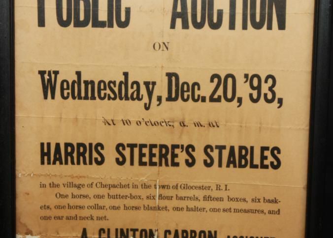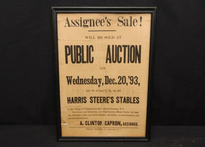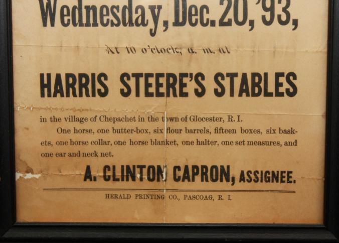 FR. 1893 R.I. ASSIGNEE'S SALE BROADSIDE,. 9X11 3/4". GREAT BROADSIDE FROM GLOUSTER, R.I. INCLUDING SALE OF HORSE, ONE BUTTER BOX, SIX BASKETS.Created By