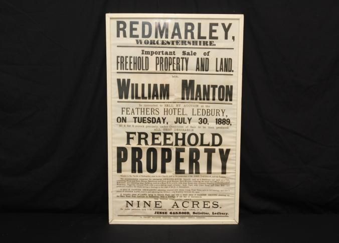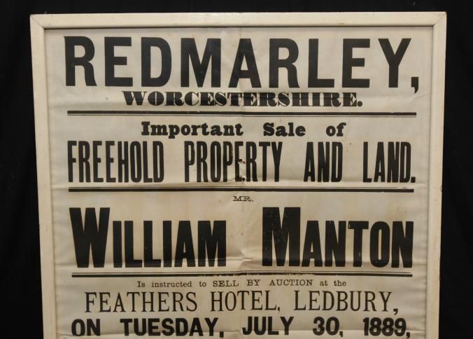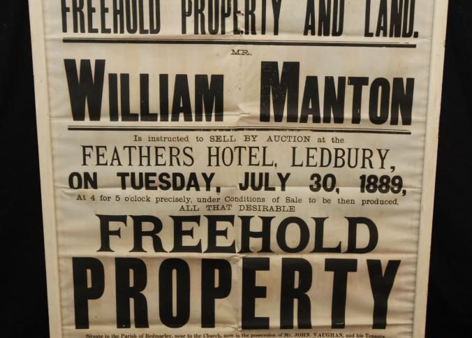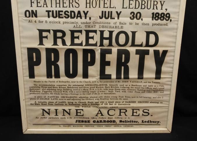 FR. 1889 REAL ESTATE BROADSIDE. 19X29". AUCTIONEER: WILLIAM MANTON WAS OFFERING "FREEHOLD PROPERTY & NINE ACRES OF LAND" AT THE FEATHERS HOTEL, LEDBURY "AT 4 FOR 5 O'CLOCK PRECISELY". A FANTASTIC MULTI-TYPE ENGLISH BROADSIDE WITH MUCH DETAIL REGARDING THE PROPERTIES BEING SOLD.Created By