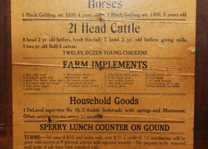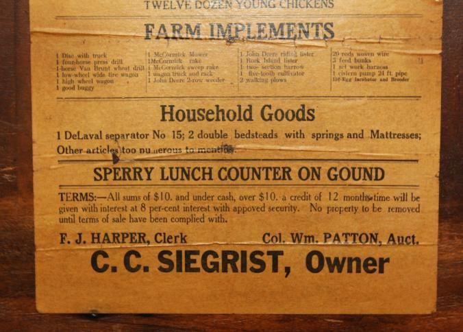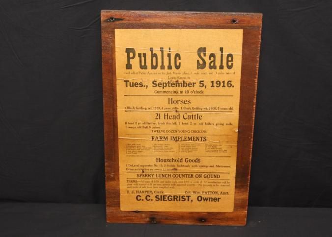 FR. 1916 KS FARM AUCTION BROADSIDE. 10X15". AUCTIONEER: COL. WM. PATTON WAS SELLING HORSES, CATTLE, FARM IMPLEMENTS AND HOUSEHOLD GOODS. "SPERRY LUNCH COUNTER ON GOUND" (NOTE: NOT A FREE LUNCH). THIS HANDBILL IS PASTED ON A BOARD JUST THE WAY THEY WOULD HAVE BEEN POSTED AT TIME OF AUCTION. A NICE KANSAS BROADSIDE.Created By