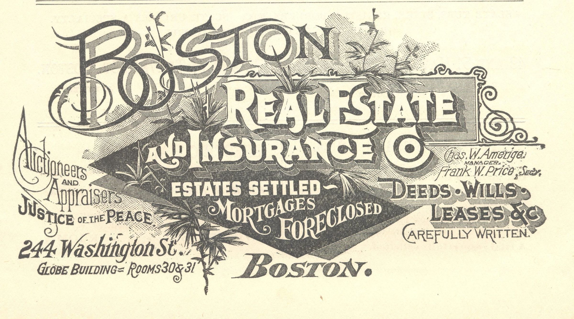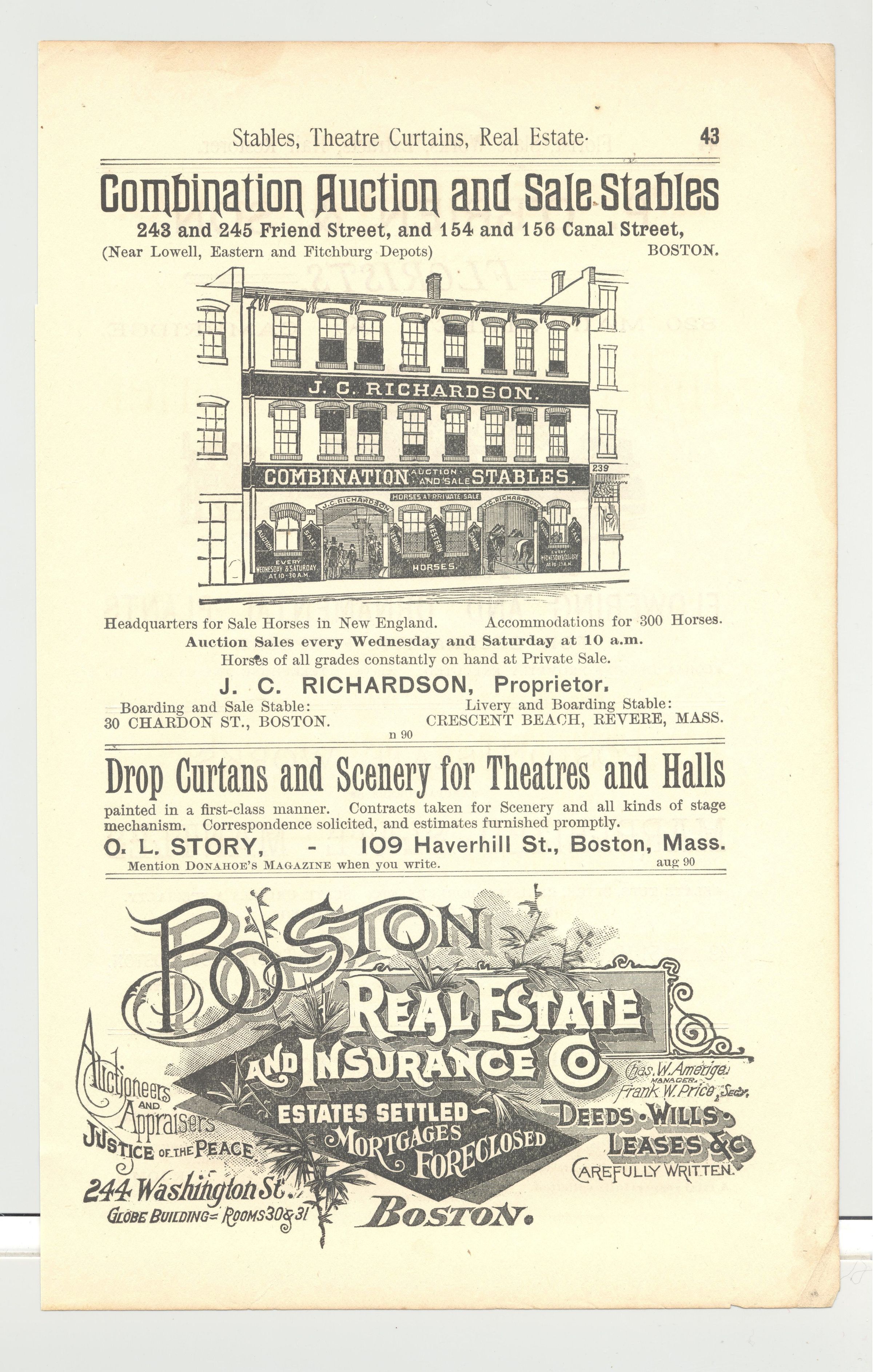 ADV, REAL ESTATE, DIM. 5 3/4" x 9 1/8", HORSE, MA. BOSTON REAL ESTATE AND INSURANCE CO. BOTTOM AD, J.C. RICHARDSON, HORSE AUCTION AND SALE STABLES, TOP AD.Created By