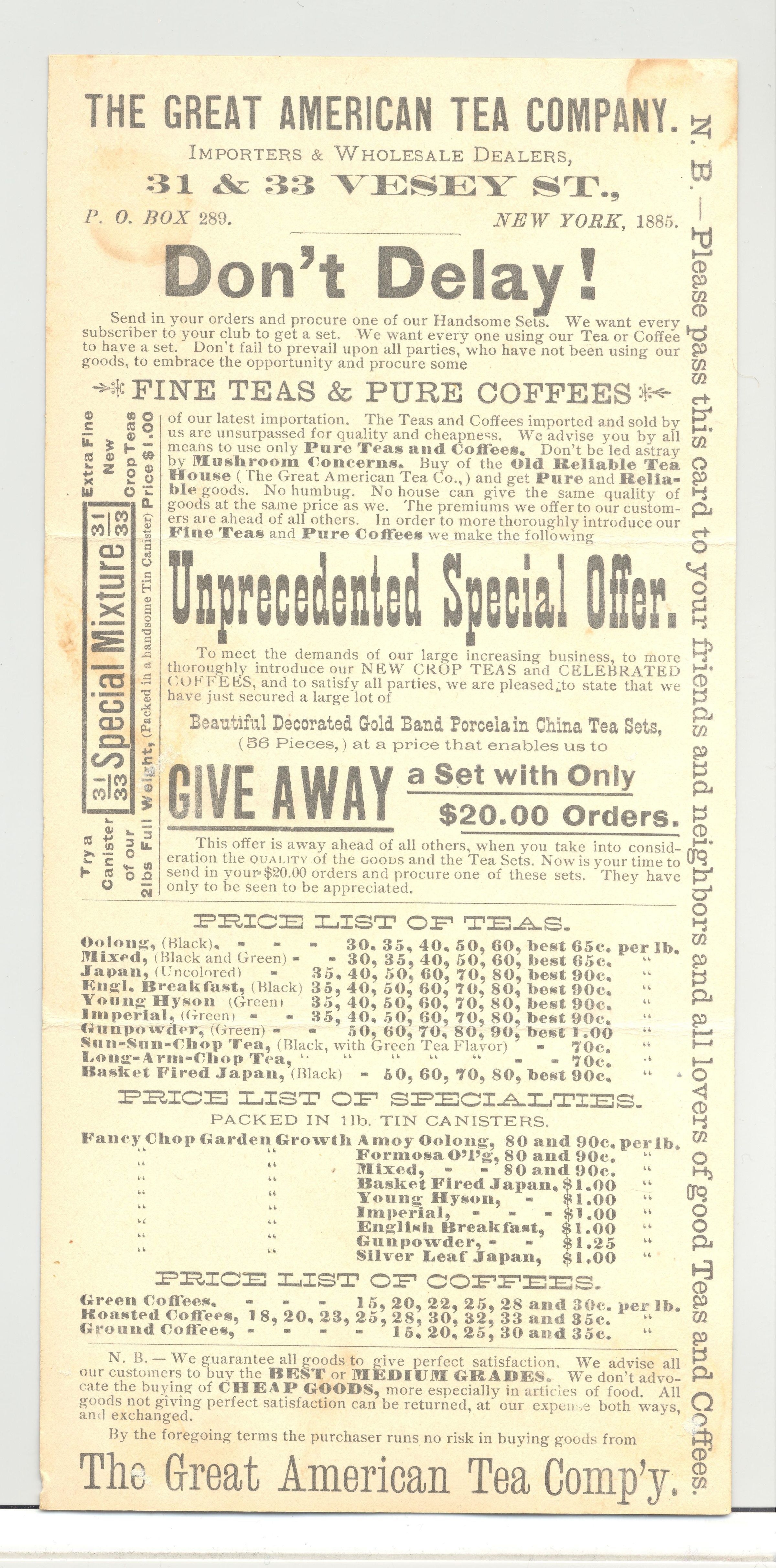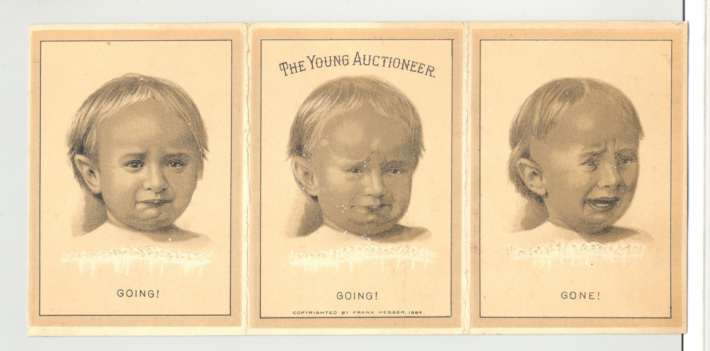 AD, 1885, TEA, 4" X 8 1/2 NY. THE GREAT AMERICAN TEA COMPANY. FINE TEAS AND PURE COFFEES. 3 PANELS ON FRONT "GOING, GOING, GONE" BABY POUT AND CRY. "THE YOUNG AUCTIONEER" BACK IS PRINTED PRICES AND ADCreated By