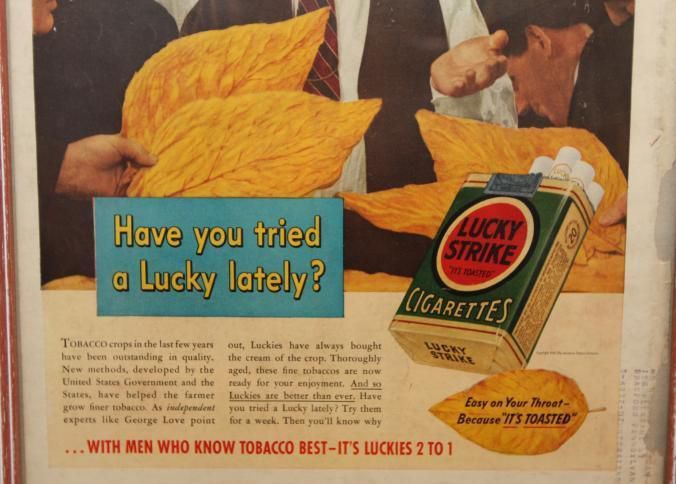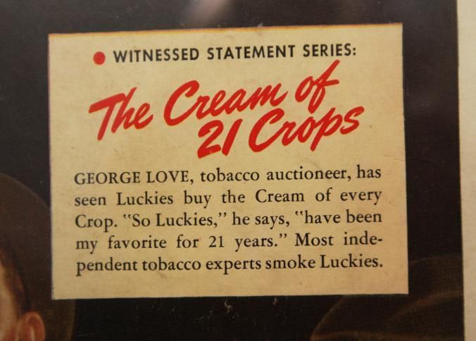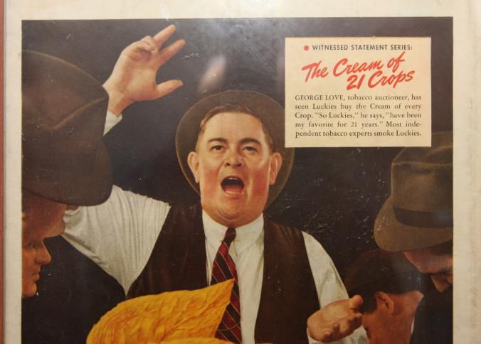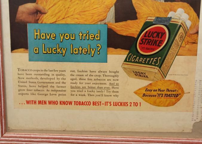 FR. 1930'S COLOR MAG. ADV. TOBACCO AUCTIONEER FOR LUCKY STRIKE. 10 1/2X14". AUCTIONEER: GEORGE LOVE SHOWN SELLING. HE IS QUOTED AS SAYING "SO LUCKIES HAVE BEEN MY FAVORITE FOR 21 YEARS. "EASY ON YOUR THROAT BECAUSE IT'S TOASTED. THIS WAS PART OF THE WITNESSED STATEMENT SERIES. GREAT GRAPHICS IN FULL COLOR.Created By