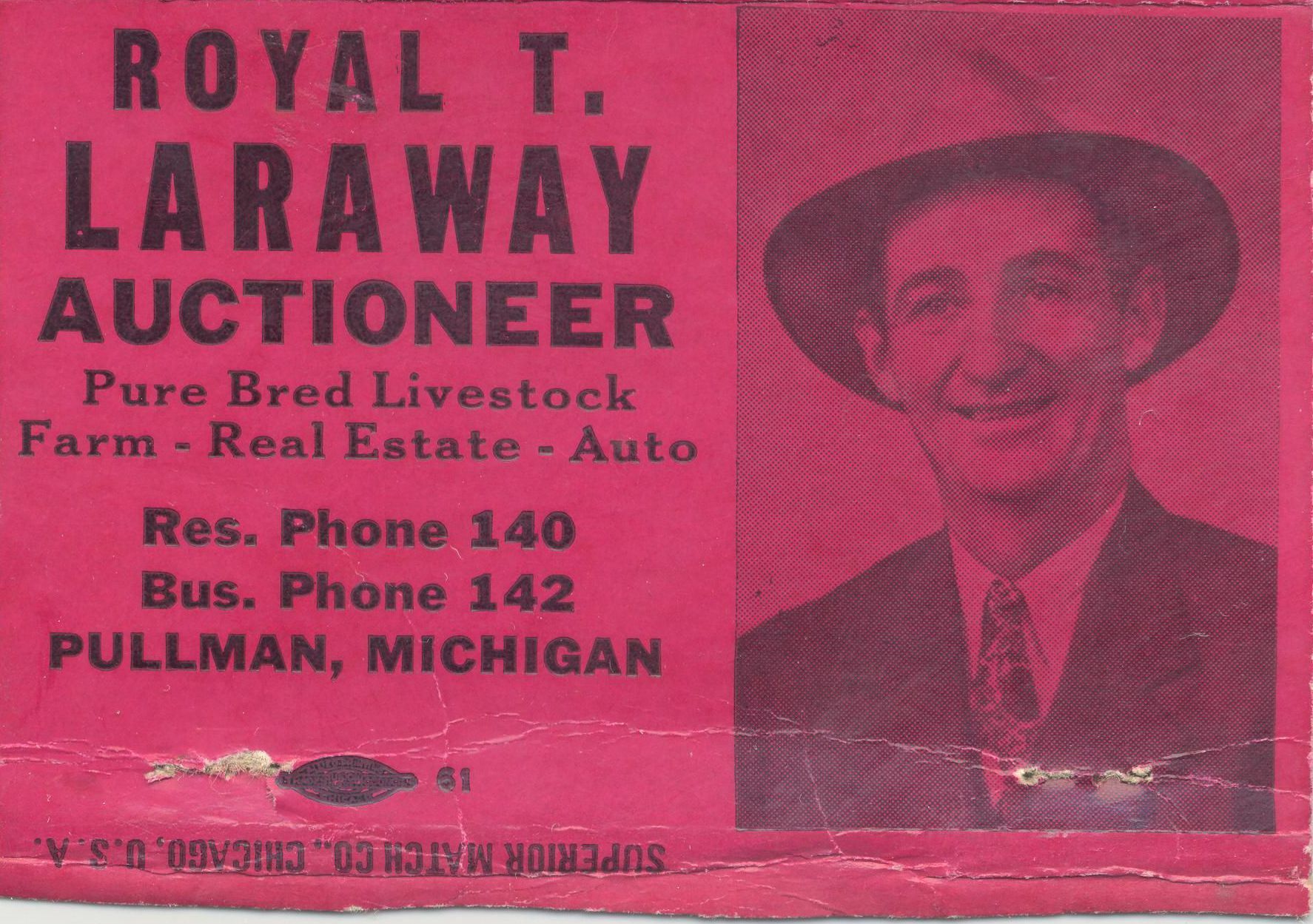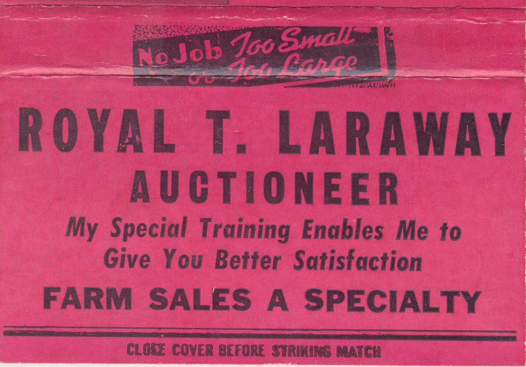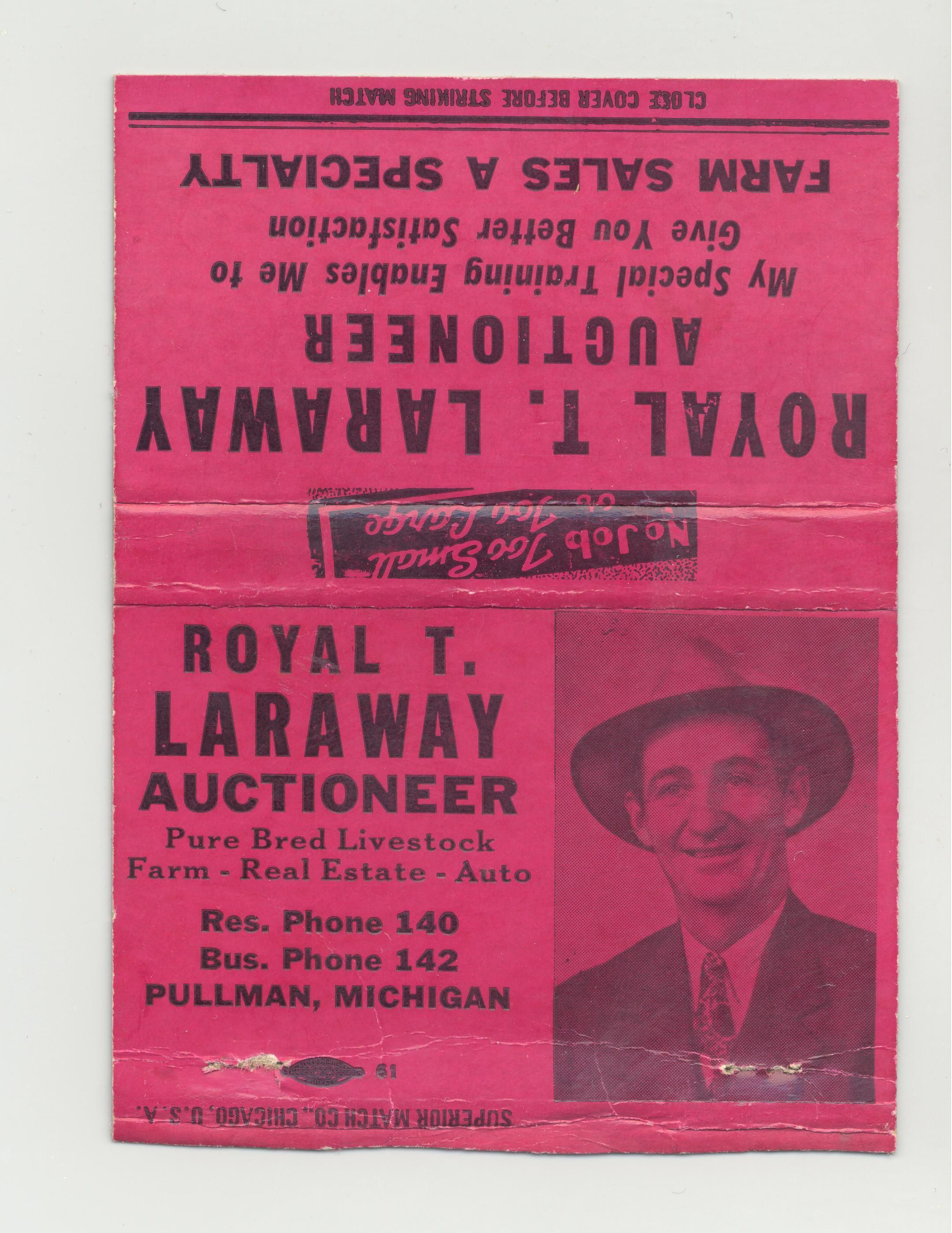 MATCHBOOK, FARM, REAL ESTATE, AUTO, MI. ROYAL T. LARAWAY, AUCTIONEER, PORTRAIT PHOTO ONE SIDE.