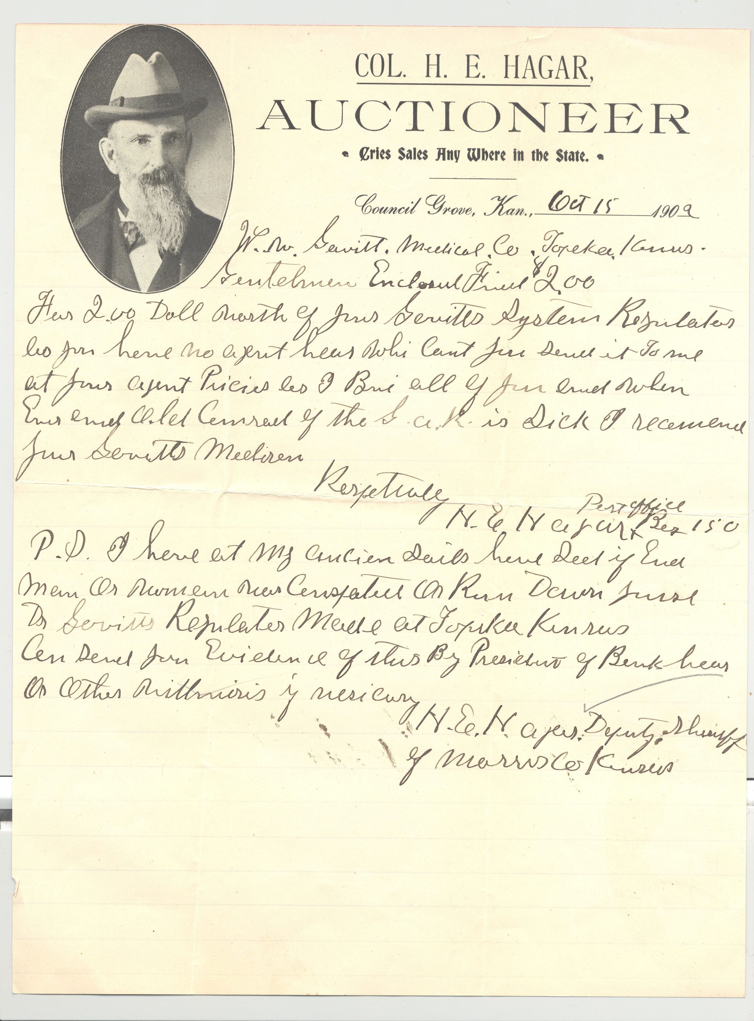 LETTER, 1909, KS. COL. H.E. HAGAR "CRIES SALES ANY WHERE IN THE STATE" PORTRAIT PRINTED IN CORNER LETTERHEADCreated By