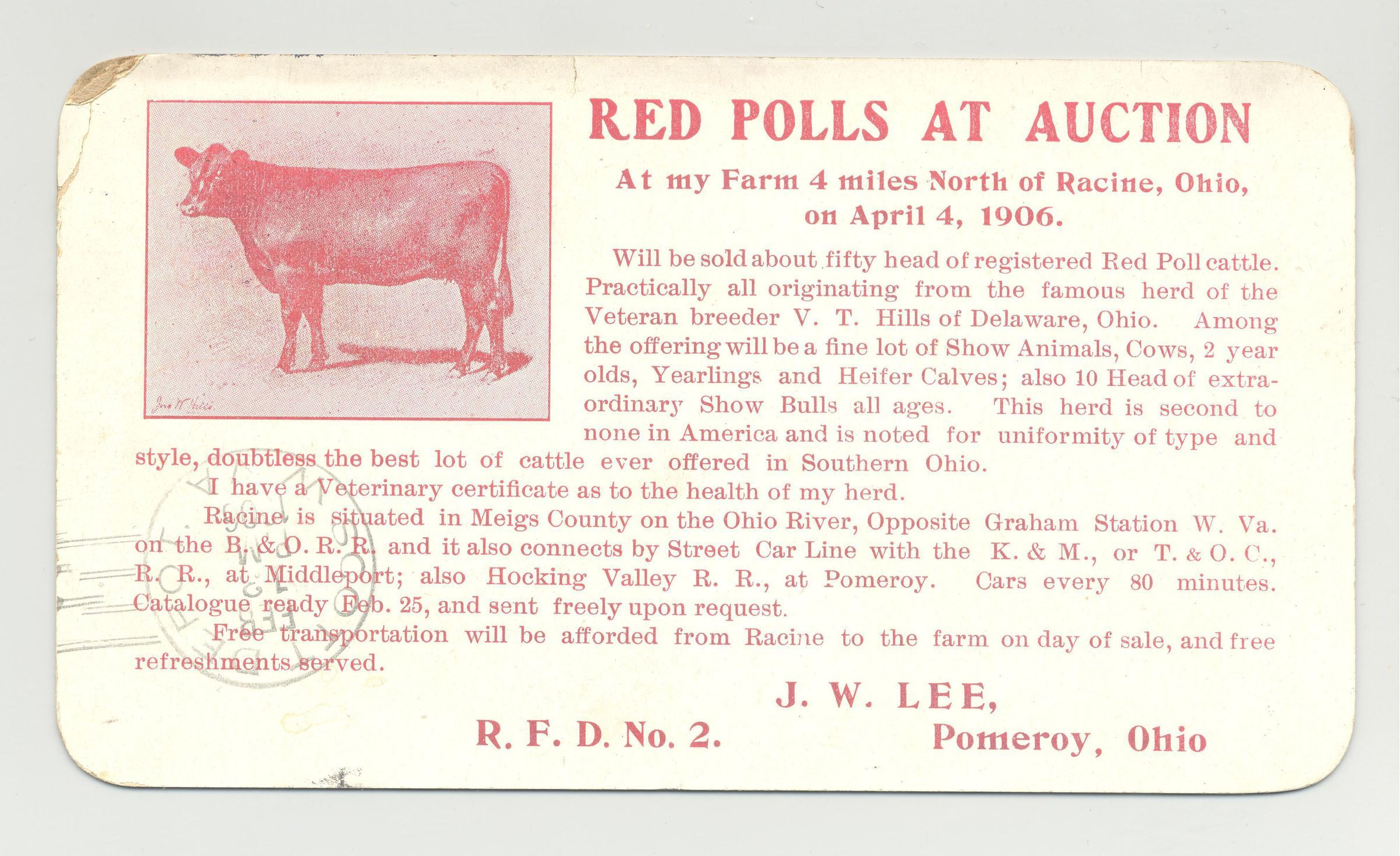 PSTCD, 1906, CATTLE, OH. J.W. LEE, PRINT OF COW, RED INK