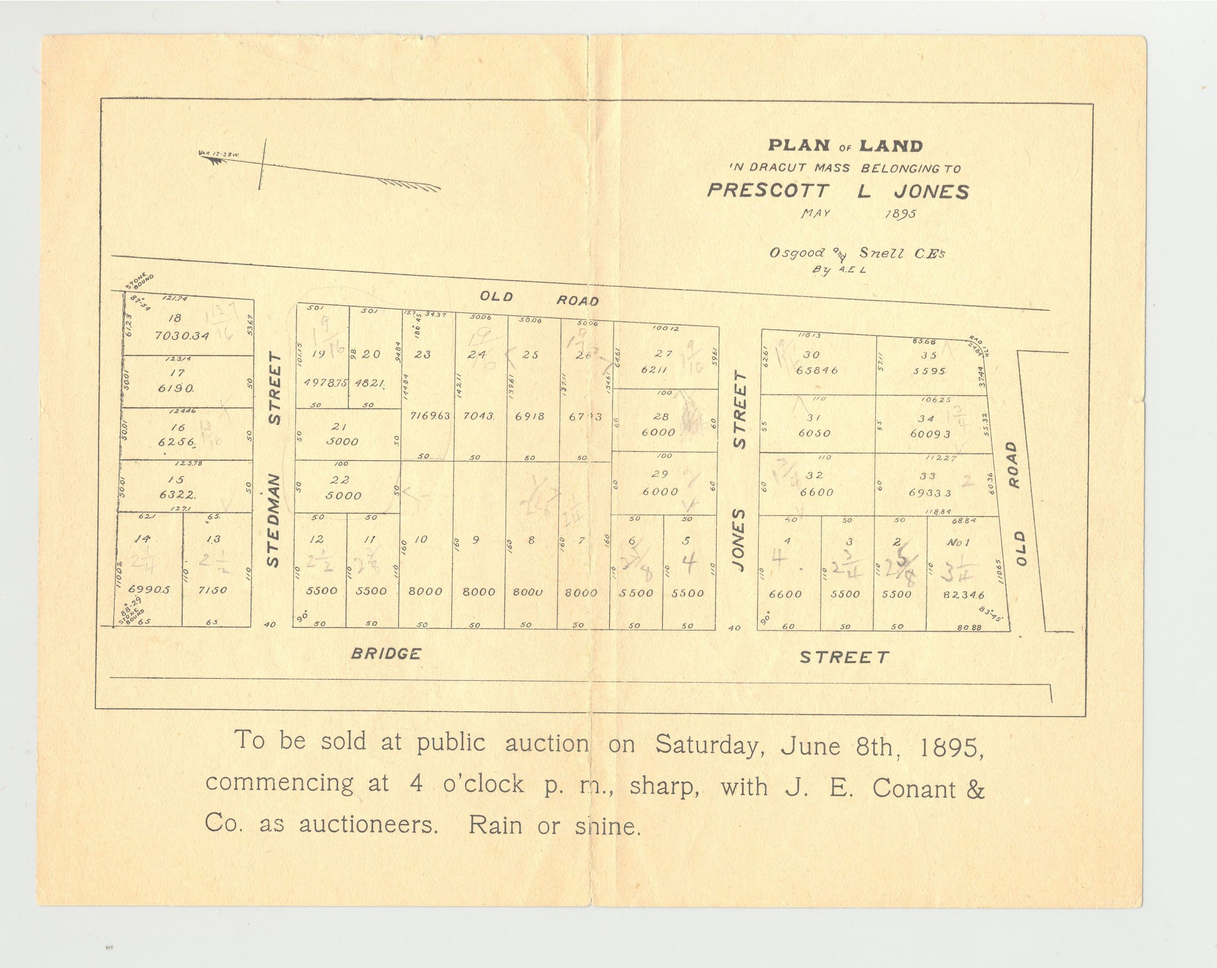 ADV, PAPER, 1895, MA. LAND - MAP WITH LOTS DRAWN, STREETS . J.E. CONANT AND CO AUCTIONEERS.