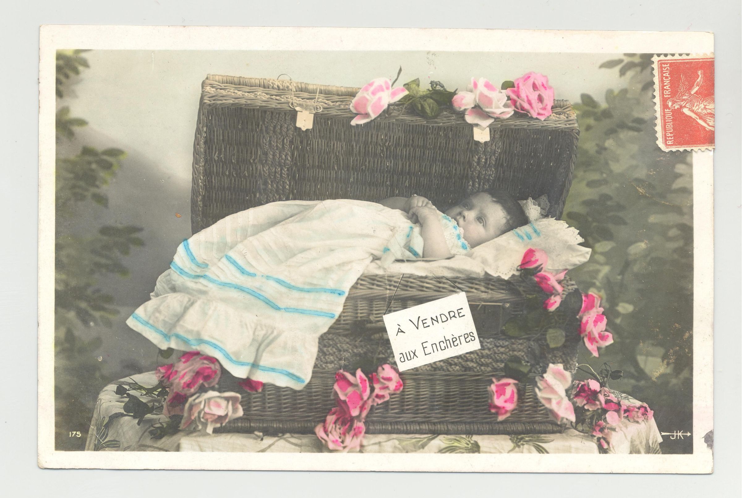 PSTCD, FRENCH. "A VENDRE AUX ENCHERES. PHOTO OF BABY IN BASKET, COLOR