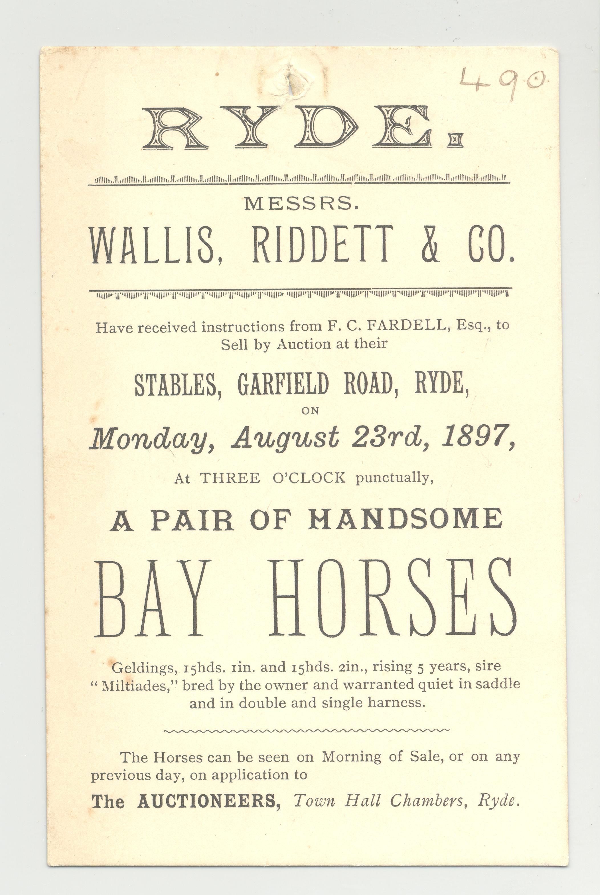 FLYER, 1897, HORSE, 4 3/4" X 3". WALLIS, RIDDETT & CO. AUCTIONEERS