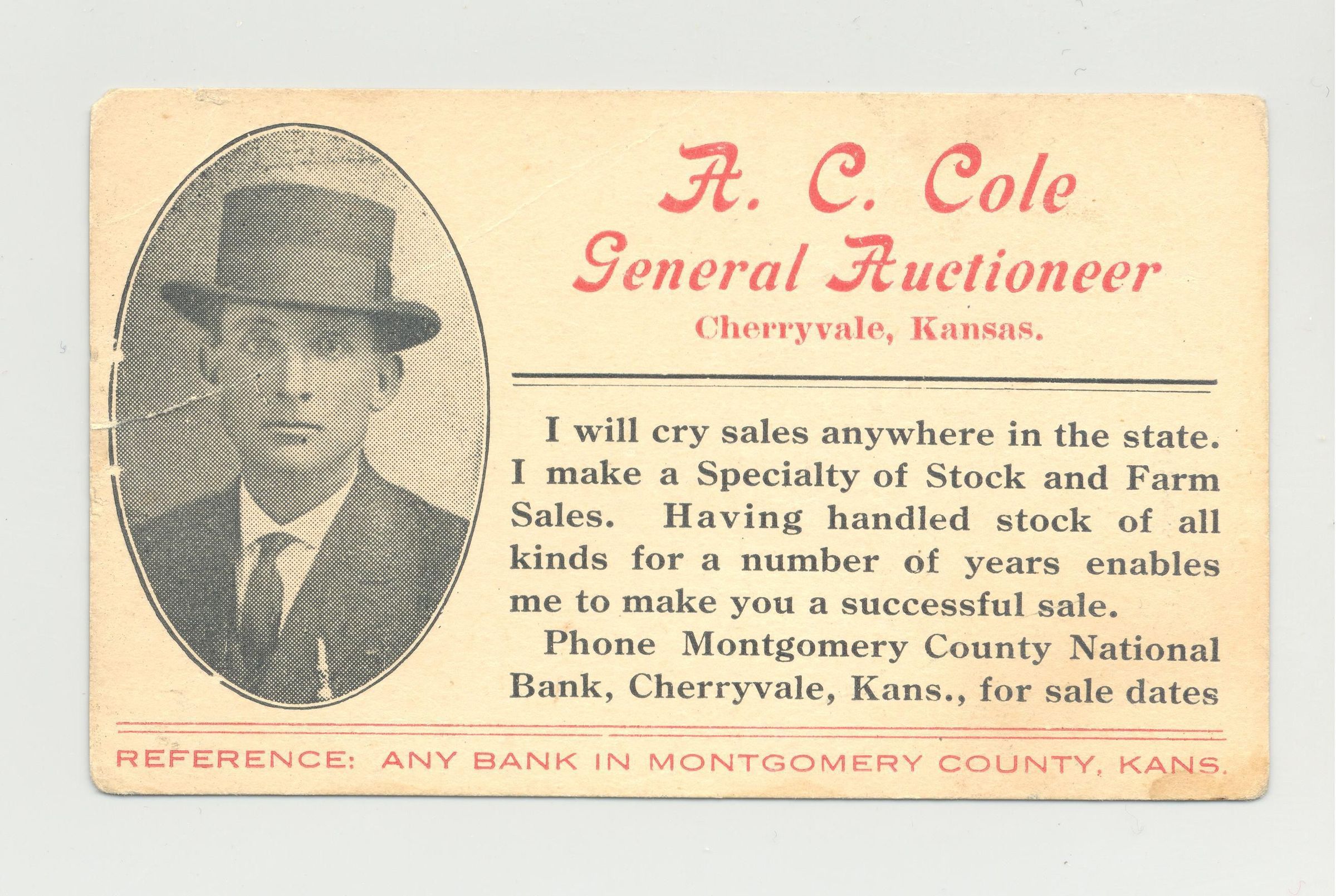 BSCD, KS. A.C. COLE, GENERAL AUCTIONEER, CHERRYVALE, KS. ON BACK "A DOZEN HINTS TO FARMERS"