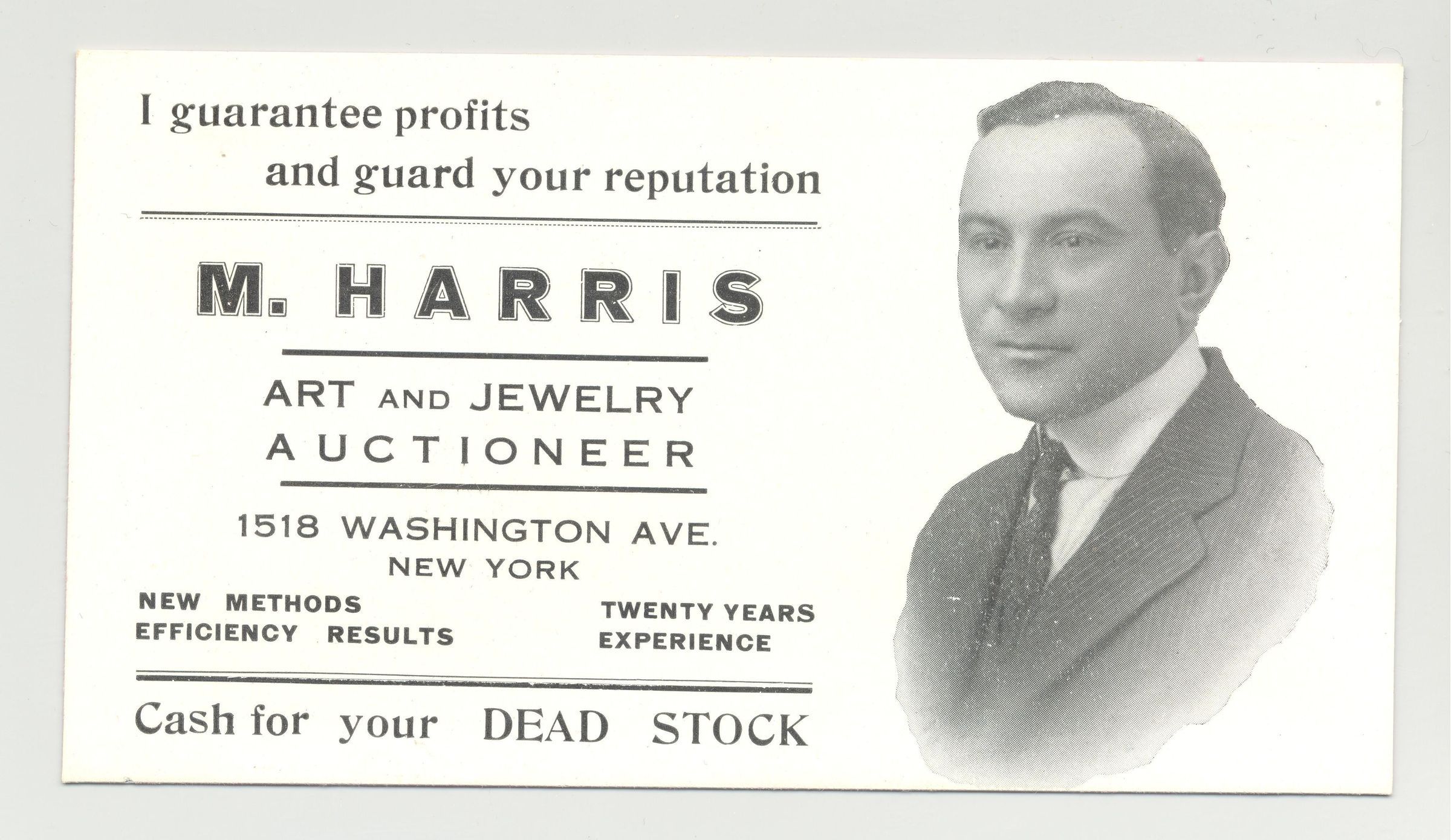 PSTCD, AD, CARDBOARD, ART, JEWELRY, NY. M. HARRIS AUCTIONEER. PORTRAIT OF HIM.