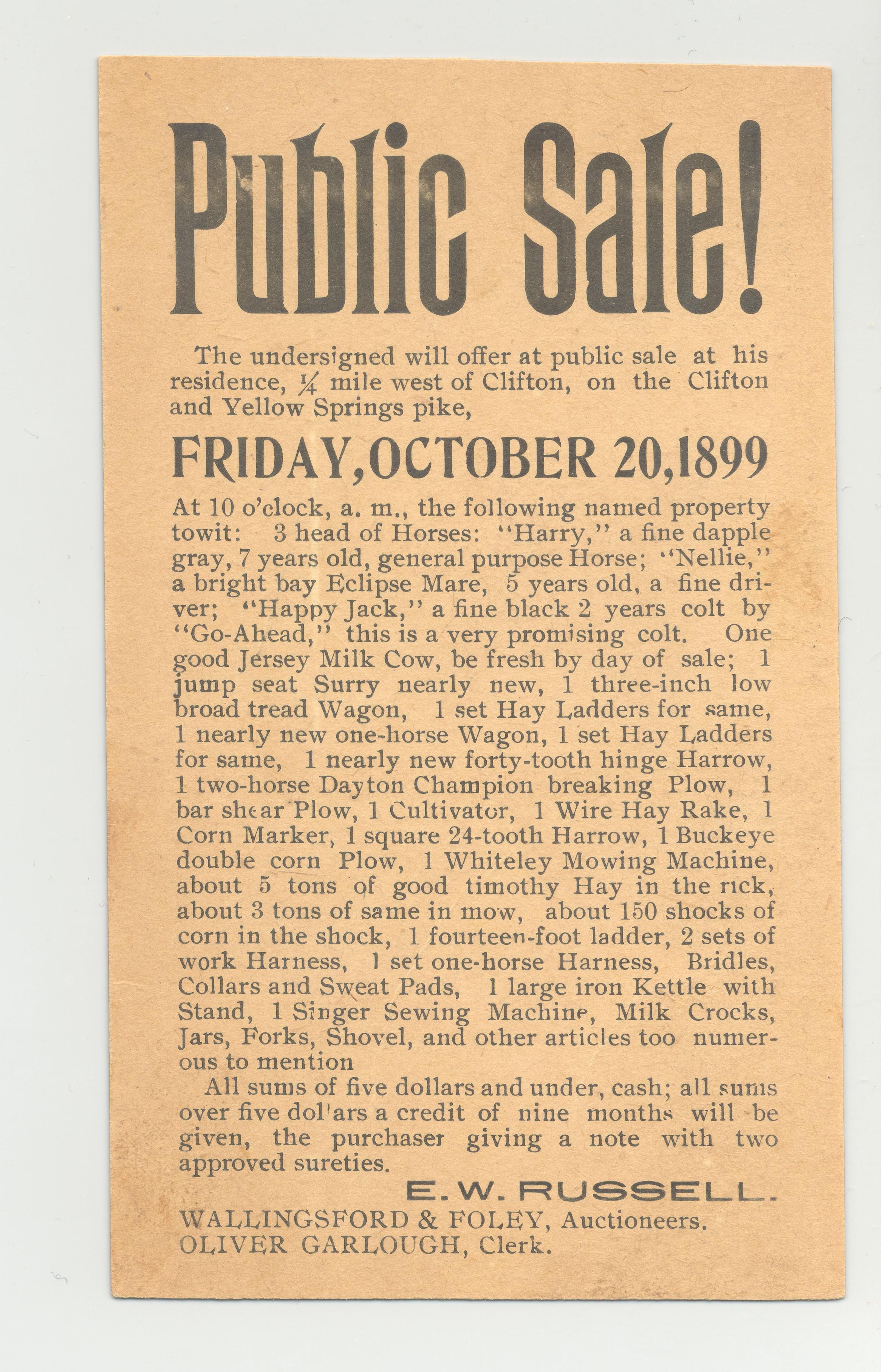 PSTCD, 1899, ESTATE, FARM. WALLINGSFORD & FOLEY, AUCTIONEERS