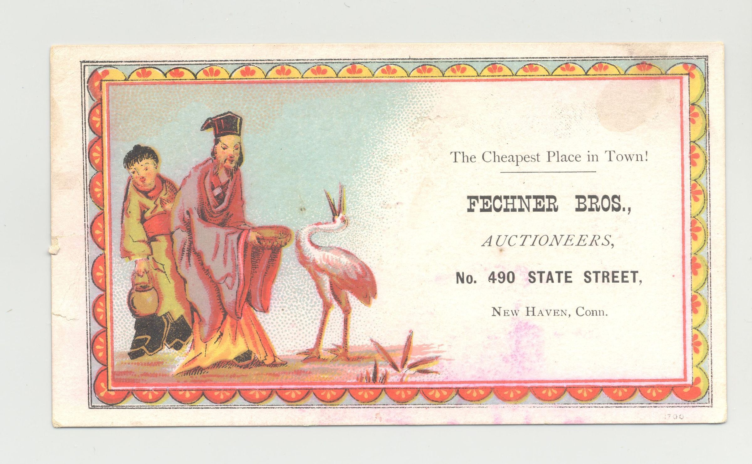 BSCD, CT. FECHNER BROS. "THE CHEAPEST PLACE IN TOWN!" COLOR PRINT OF MAN, WOMAN, BIRD. 2 5/8" X 4 5/8"Created By
