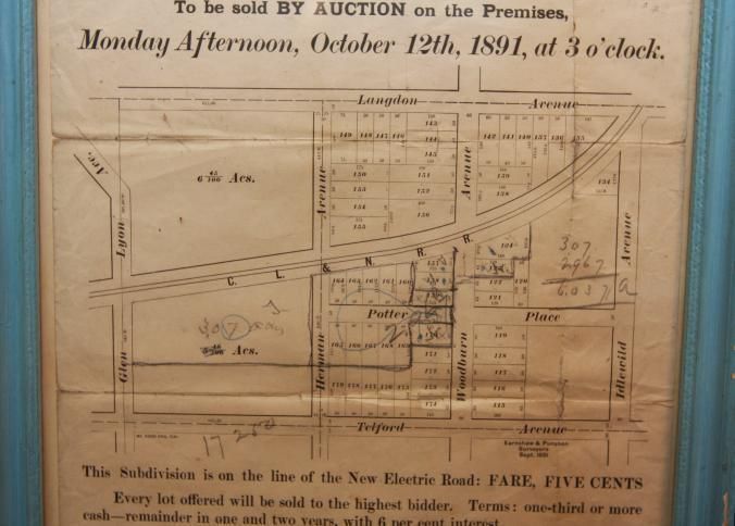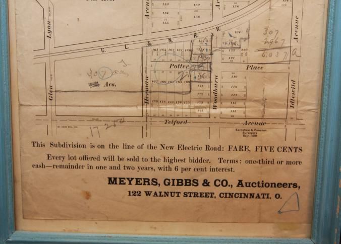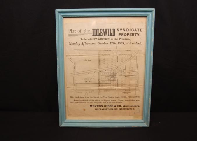 FR. 1891 OHIO REAL ESTATE AUCTION HANDBILL. 9 1/2X10 1/2". AUCTIONEERS MEYERS, GIBBS & CO. FROM 122 WALNUT ST. CINCINNATI, OHIO OFFERED LOTS FROM A SUBDIVISION KNOWN AS "PLAT OF THE IDLEWILD SYNDICATE PROPERTY", THAT IS ON THE LINE OF THE "NEW ELECTRIC ROAD. FARE FIVE CENTS. EVERY LOT OFFERED WILL BE SOLD TO THE HIGHEST BIDDER. TERMS: 1/3 OR MORE CASH - REMAINDER IN ONE AND TWO YEARS, WITH 6% INTEREST, GREAT DETAILED MAP OF SUBDIVISION.Created By