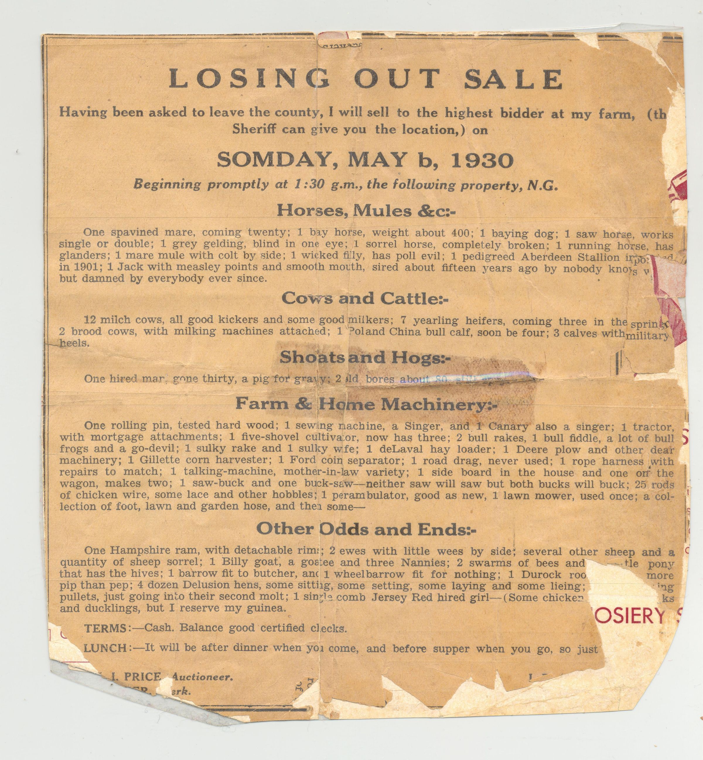 FLYER, 1930, FARM, ESTATE. "LOSING OUT SALE"