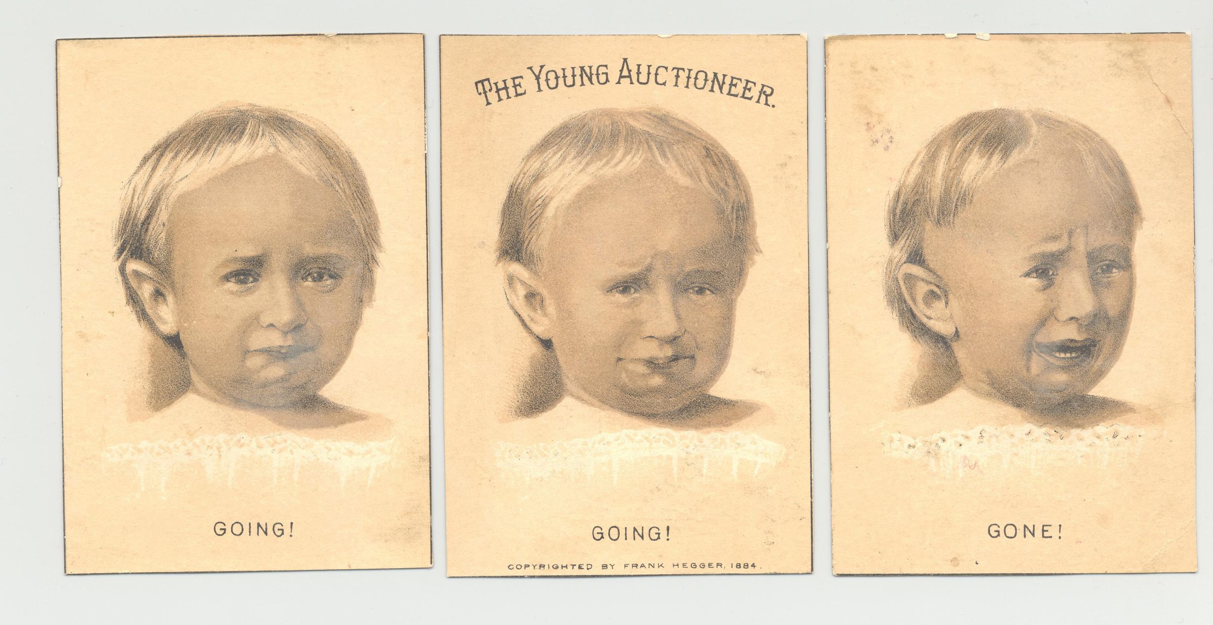 AD, 1884, TEA, NY. (CUT IN THREE) THE GREAT AMERICAN TEA COMPANY. FINE TEAS AND PURE COFFEES. 3 PANELS ON FRONT "GOING, GOING, GONE" BABY POUT AND CRY. "THE YOUNG AUCTIONEER" BACK IS PRINTED PRICES AND ADCreated By