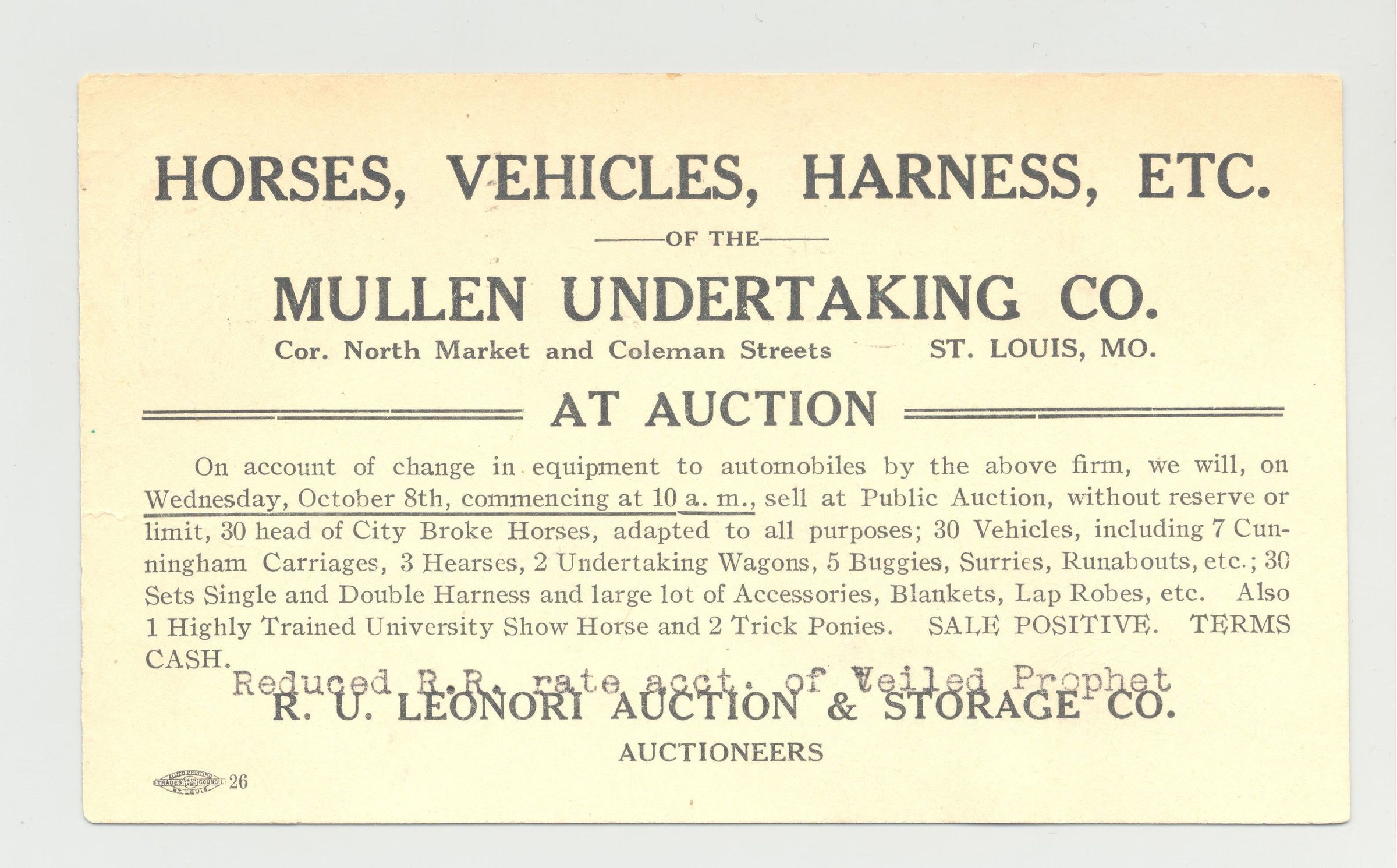 PSTCD, 1913, HORSE, EQUIPMENT, MO. R.U. LEONORI AUCTION & STORAGE CO.
