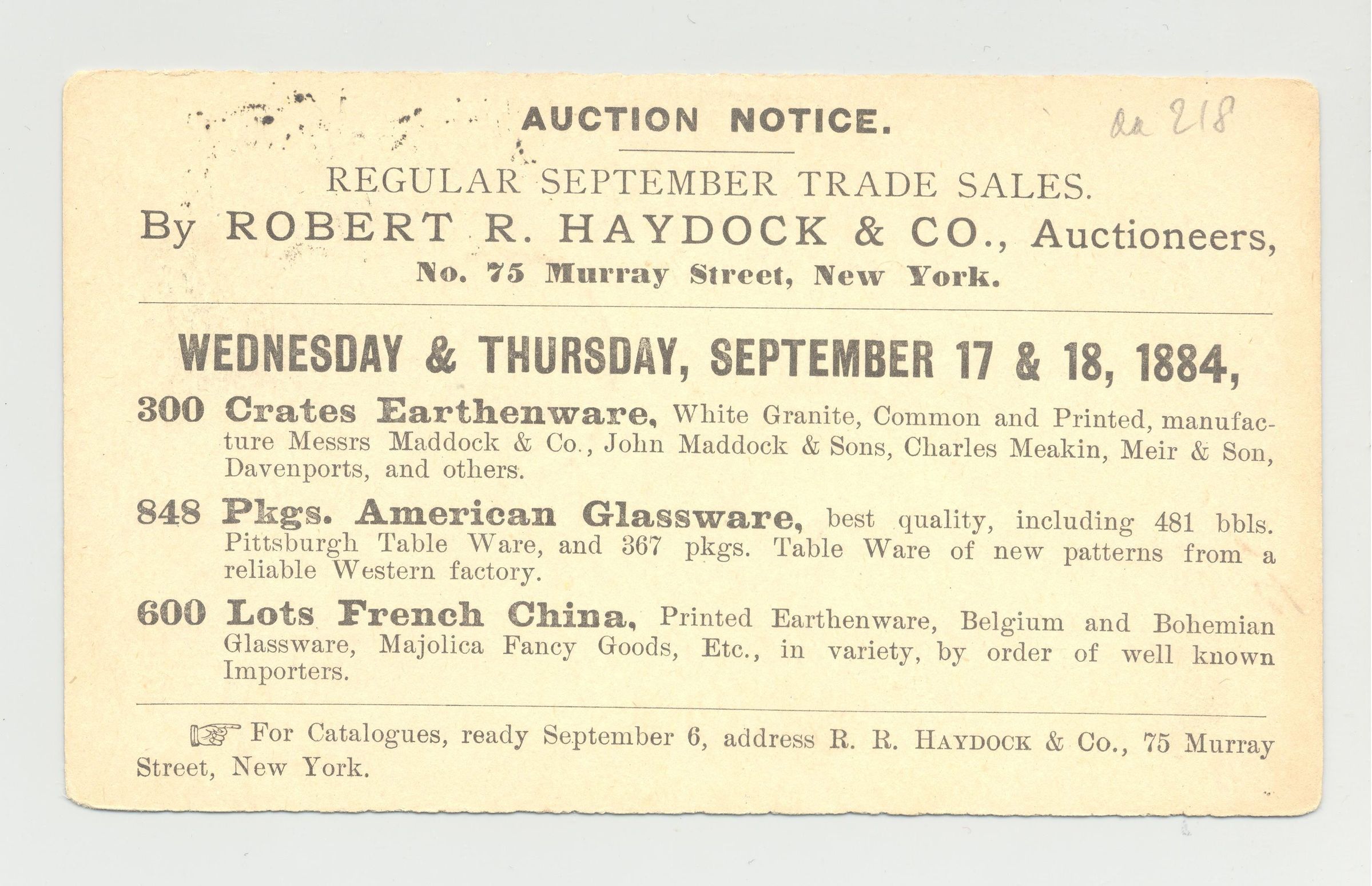 PSTCD, 1884, GLASSWARE, CHINA, NY. ROBERT R. HAYDOCK & CO AUCTIONEERS