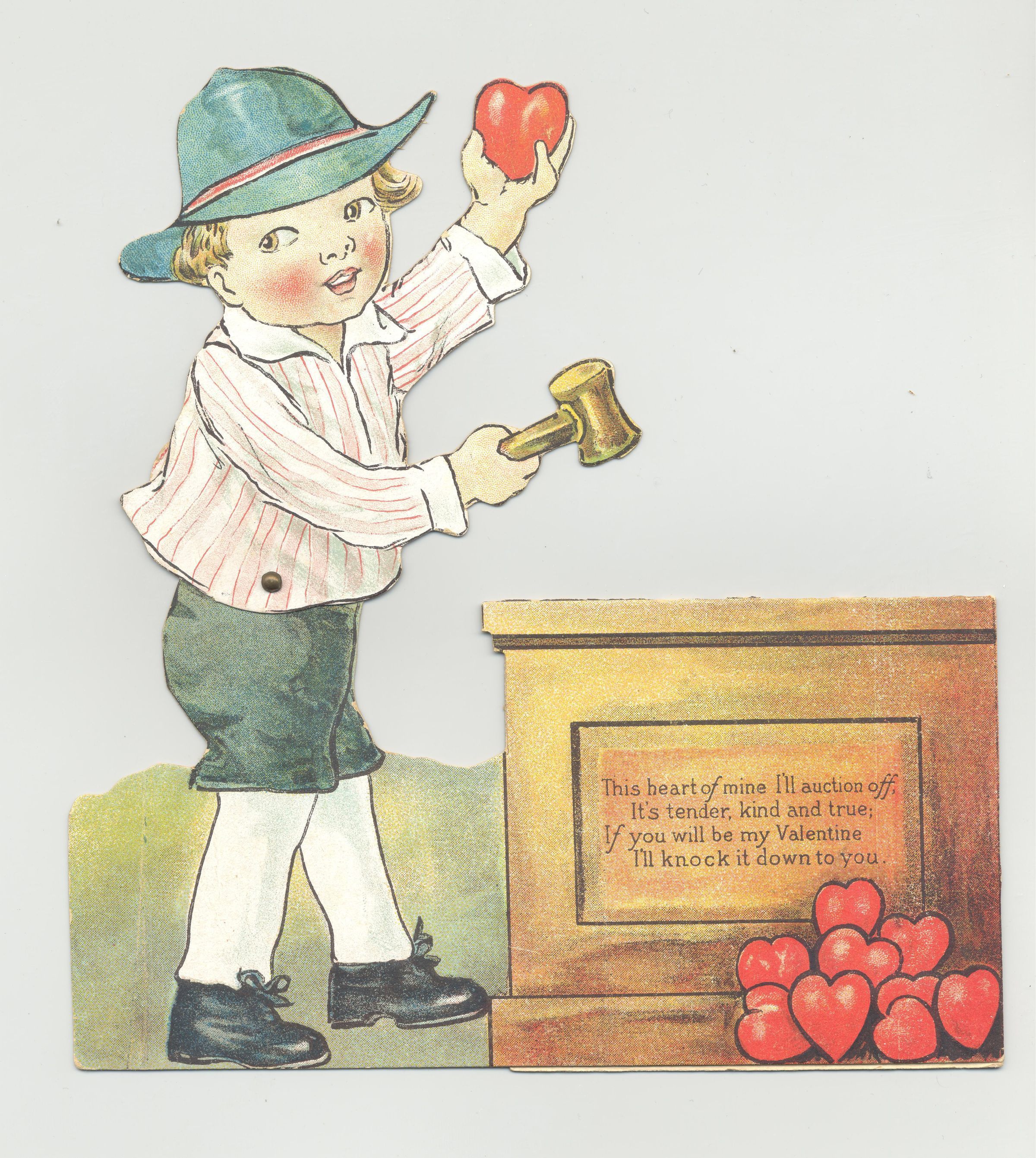 CARDBOARD CUTOUT VALENTINE. "THIS HEART OF MINE, I'LL AUCTION OFF IT'S TENDER, KIND AND TRUE, IF YOU WILL BE MY VALENTINE I'LL KNOCK IT DOWN TO YOU." CHILD WITH GAVEL AND HEARTCreated By