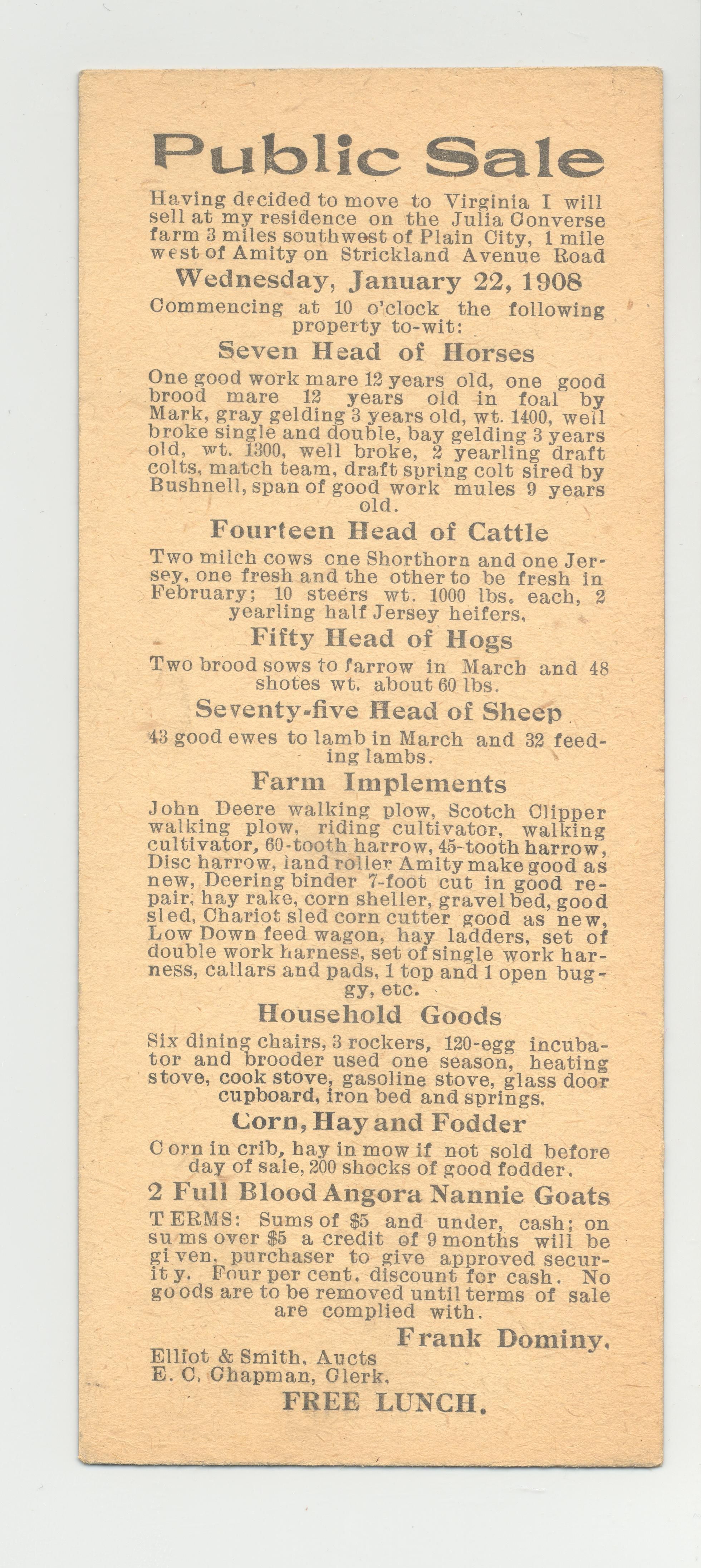 PSTCD, ADV, FARM, LIVESTOCK, 1908, ELLIOT & SMITH, AUCTS. BLANK ONE SIDE 6 1/2" X 2 3/4"