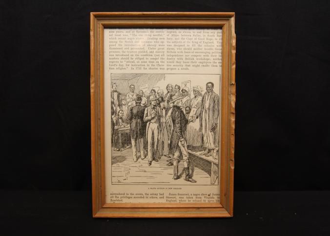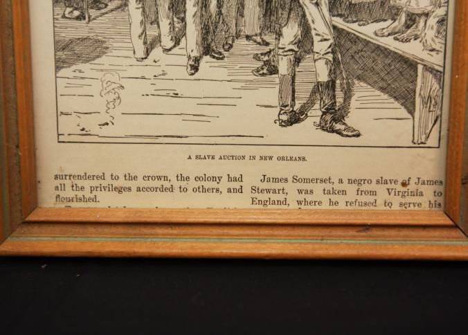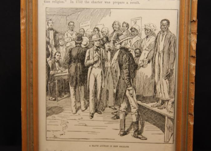 FR. 19THC ENGRAVING "A SLAVE AUCTION IN NEW ORLEANS" 5X7". A SMALL, BUT DETAILED SCENE OF SLAVES STANDING ON BENCH FOR INSPECTION BY BIDDERS. AUCTIONEER AND CLERK IN BACKGROUND.Created By