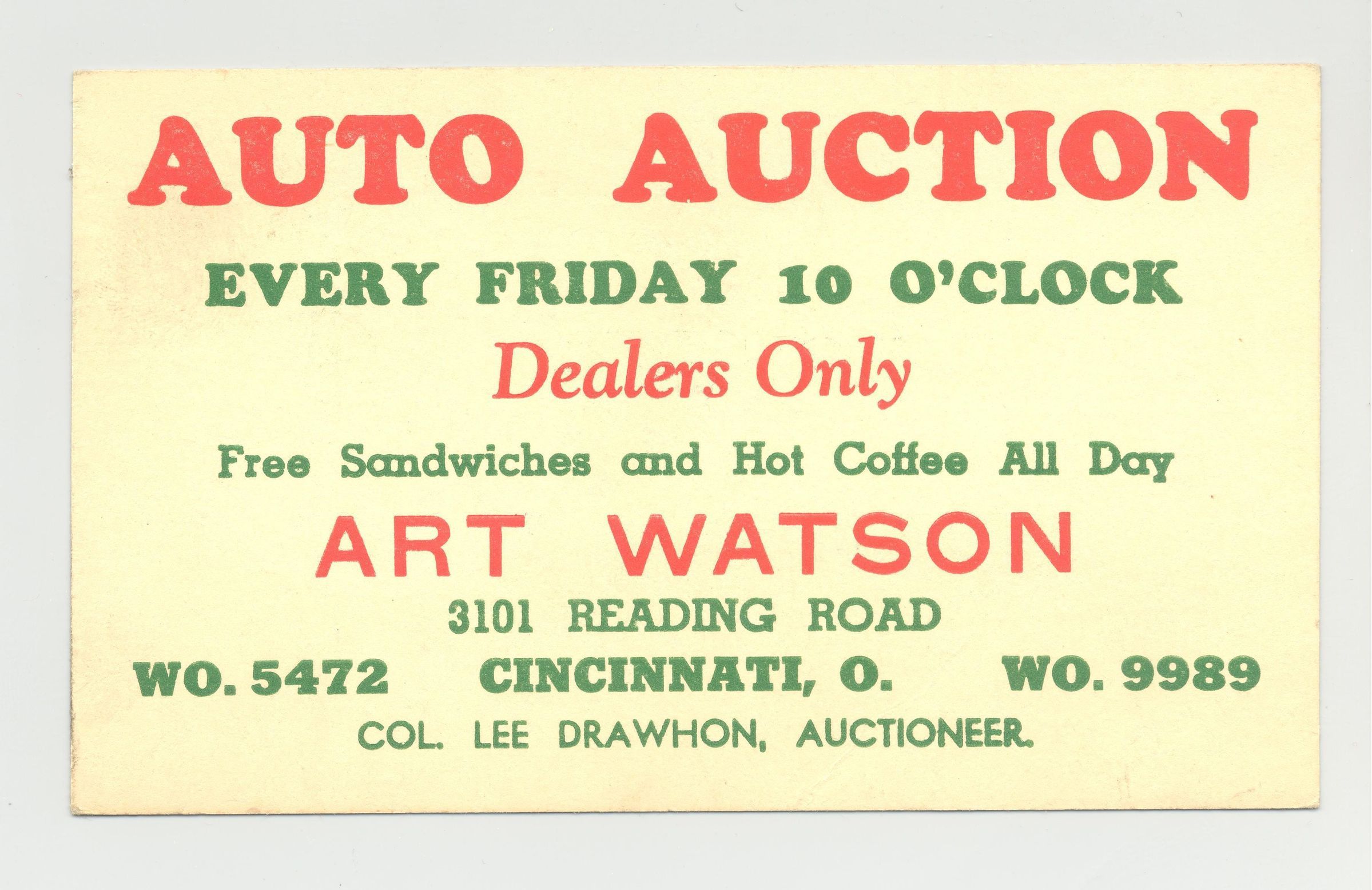 PSTCD, 1949, AUTO, OH. ART WATSON. COL. LEE DRAWHON, AUCTIONEER