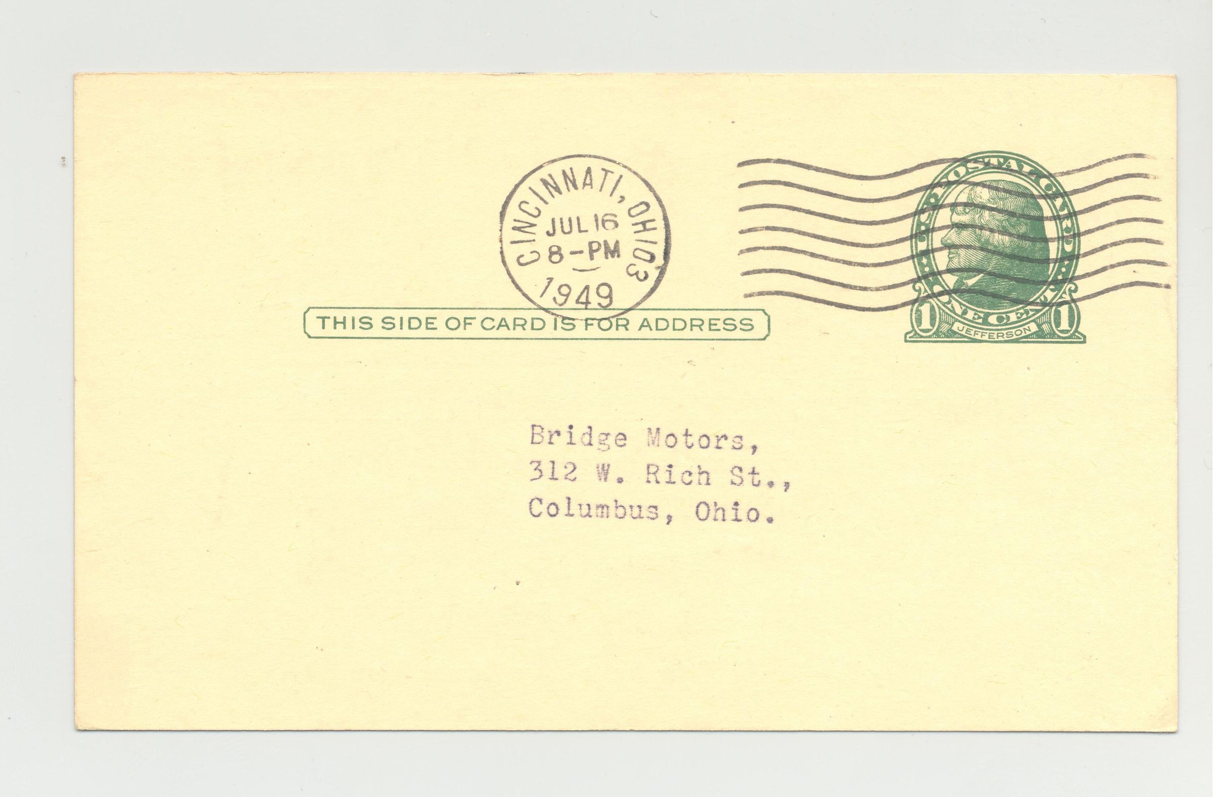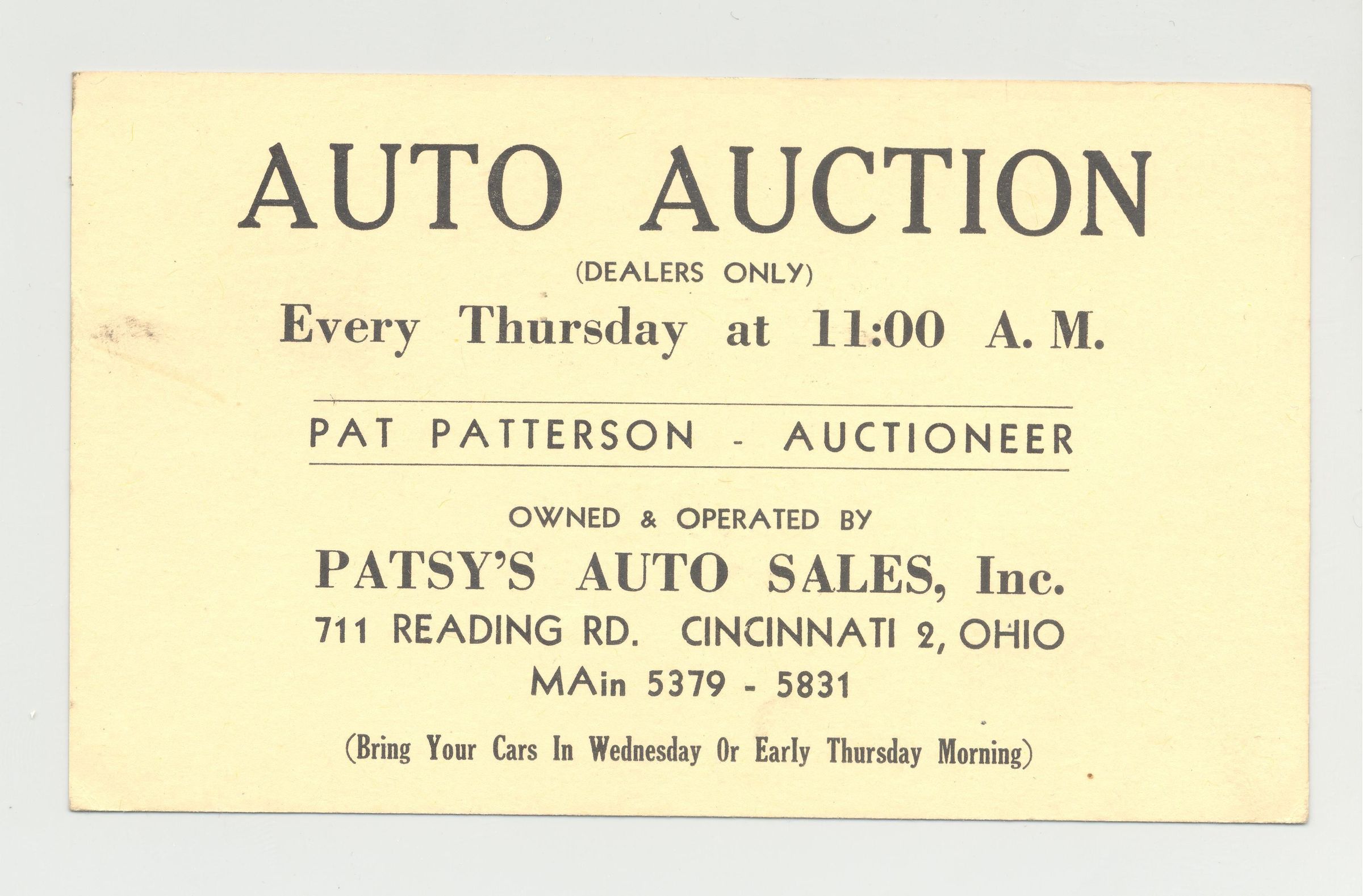 PSTCD, AUTO, 1949, OH. PAT PATTERSON, AUCTIONEER, PATSY'S AUTO SALES, INC.