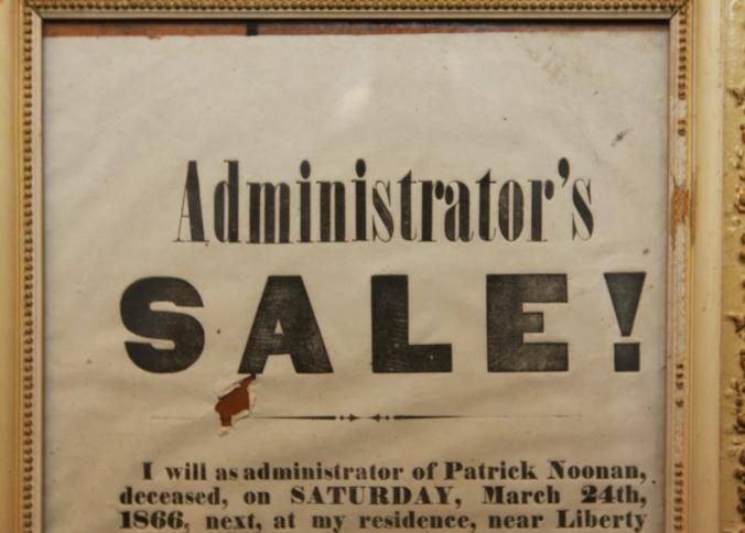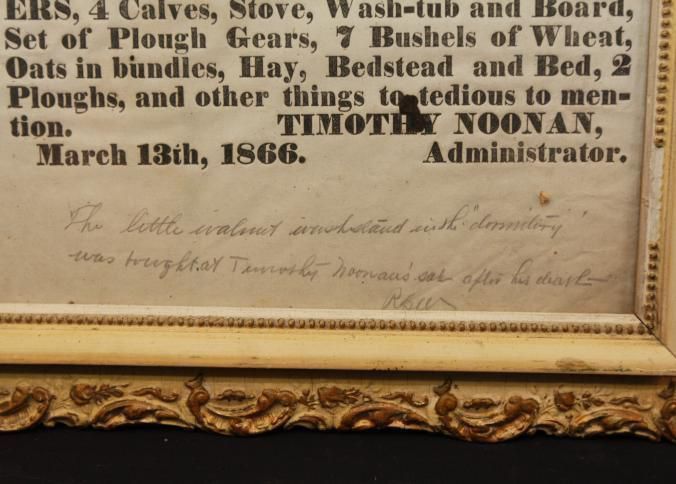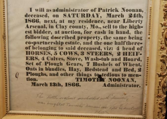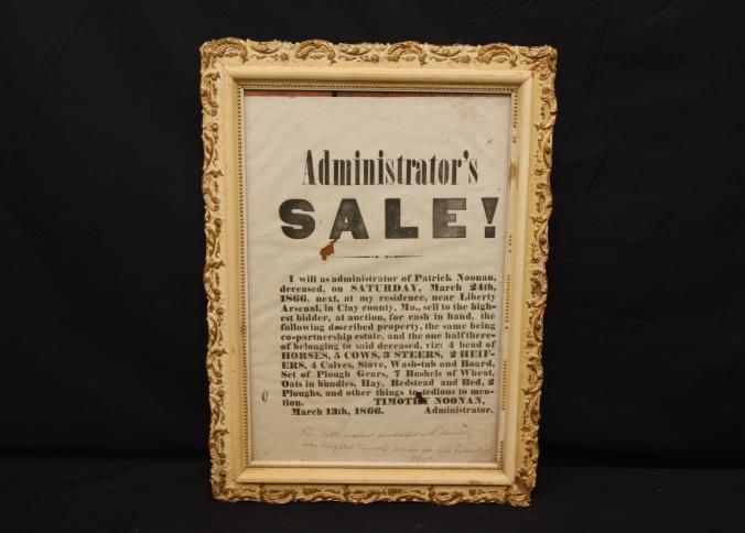 FR. 1866 MO. "ADMINISTRATOR'S SALE" AUCTION BROADSIDE. 9X13". "I WILL AS ADMINISTRATOR OF PATRICK NOONAN DECEASED, ON SATURDAY, MARCH 24TH, 1866, NEXT, AT MY RESIDENCE, NEAR LIBERTY ARSENAL, IN CLAY COUNTY, MO., SELL TO THE HIGHEST BIDDER, AT AUCTION, FOR CASH IN HAND, THE FOLLOWING DESCRIBED PROPERTY, THE SAME BEING CO-PARTNERSHIP ESTATE, AND THE ONE HALF THERE OF BELONGING TO SAID DECEASED, VIZ: 4 HEAD OF HORSES, 5 COWS, 3 STEERS, 2 HEIFERS, 4 CALVES, STOVE, WASHTUB AND BOARD, SET OF POUGH GEARS, 7 BUSHELS OF WHEAT, OATS IN BUNDLES, HAY, BEDSTEAD AND BED, 2 PLOUGHS, AND OTHER THINGS TOO TEDIOUS TO MENTION." SIGNED TIMOTHY NOONAN, ADMINISTRATOR. NOTE: THERE IS A HANDWRITTEN NOTE IN PENCIL AT BOTTOM "THE LITTLE WALNUT WASHSTAND WITH "DORMITORY" WAS BOUGHT AT TIMOTHY NOONAN'S SALE AFTER HIS DEATH." FANCY FRAME, GREAT EARLY PIECE OF MISSOURI AMERICANA.Created By