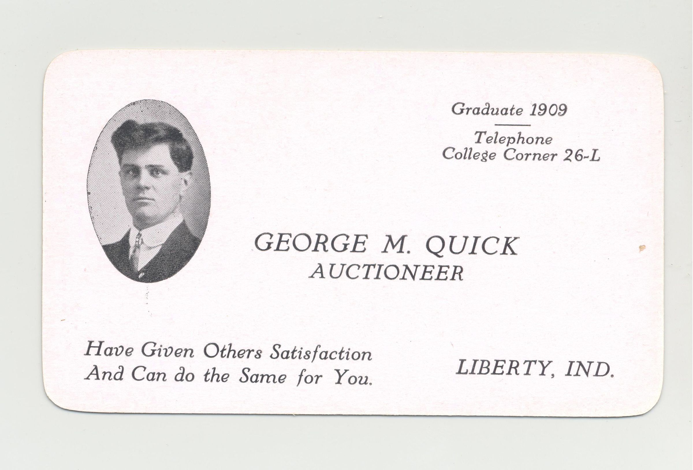 BSCD, IN. GEORGE M. QUICK, AUCTIONEER. GRAD 1909, PORTRAIT OF MAN, "HAVE GIVEN OTHERS SATISFACTION AND CAN DO THE SAME FOR YOU"Created By