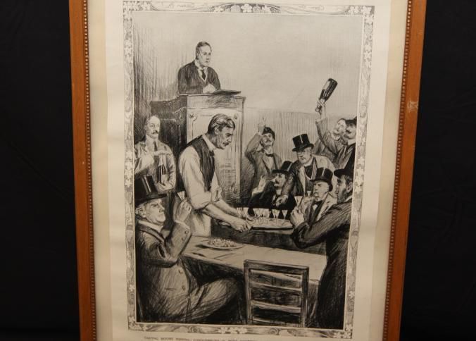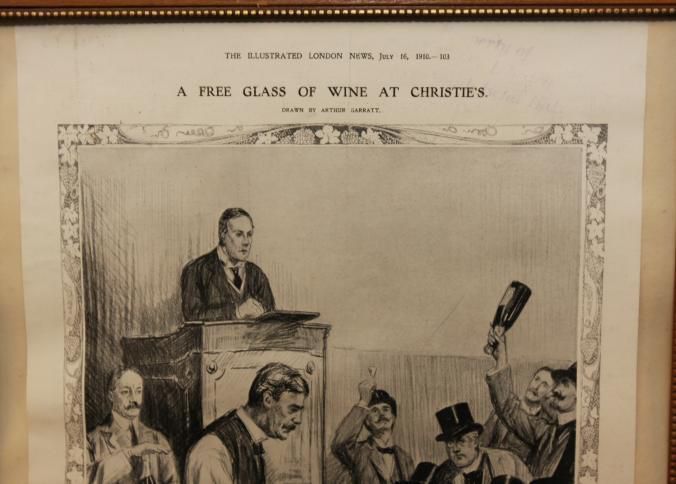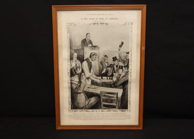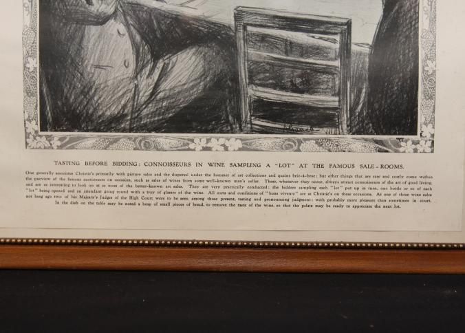 FR. 1910 ENGRAVED WINE AUCTION SCENE FROM ILL. LONDON NEWS. 10 1/2X15 1/2". "A FREE GLASS OF WINE AT CHRISTIE'S DRAWN BY ARTHUR GARRATT." AT THE TOP. UNDER ILLUSTRATION IS - "TASTING BEFORE BIDDING: CONNOISSEURS IN WINE SAMPLING A "LOT" AT THE FAMOUS SALE-ROOMS." THE DETAILED PARAGRAPH BELOW THE ILLUSTRATION DETAILS WHAT IS HAPPENING IN THE SCENE FROM ONE OF CHRISTIE'S WINE AUCTIONS. IN BRIEF, A BOTLE FROM EACH LOT IS OPENNED AND SAMPLED BY ALL SERIOUS BIDDERS, BIDDING COMMENCES IMMEDIATELY. NOTE THE PLATE OF BREAD ON THE TABLE USED FOR REMOVING THE TASTE OF THE PREVIOUS WINE FROM THE MOUTH IN PREPARATION FOR "PREVIEWING" THE NEXT LOT.Created By