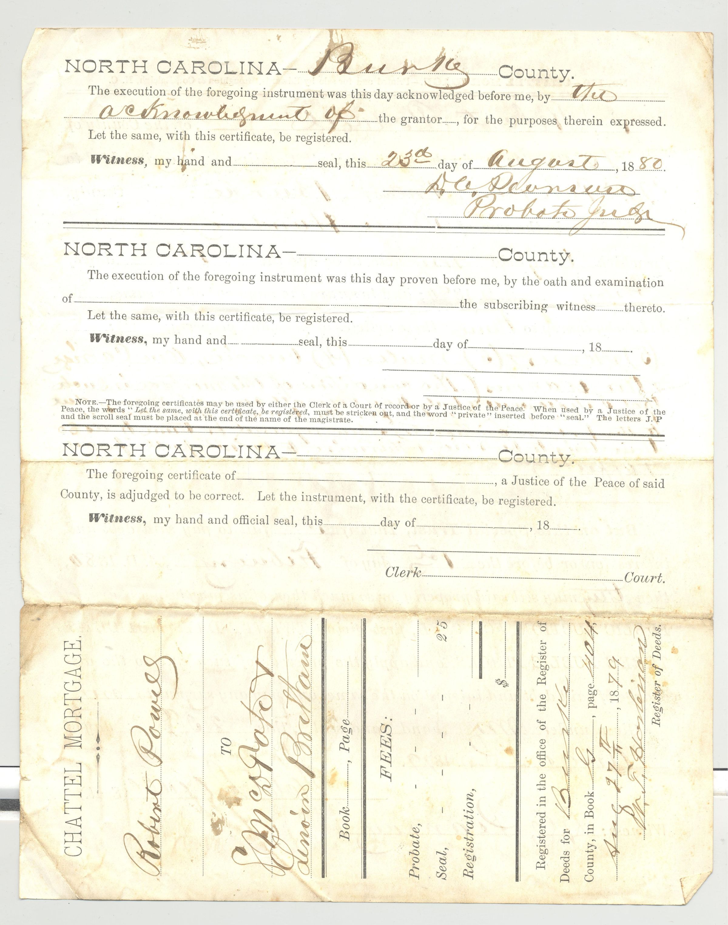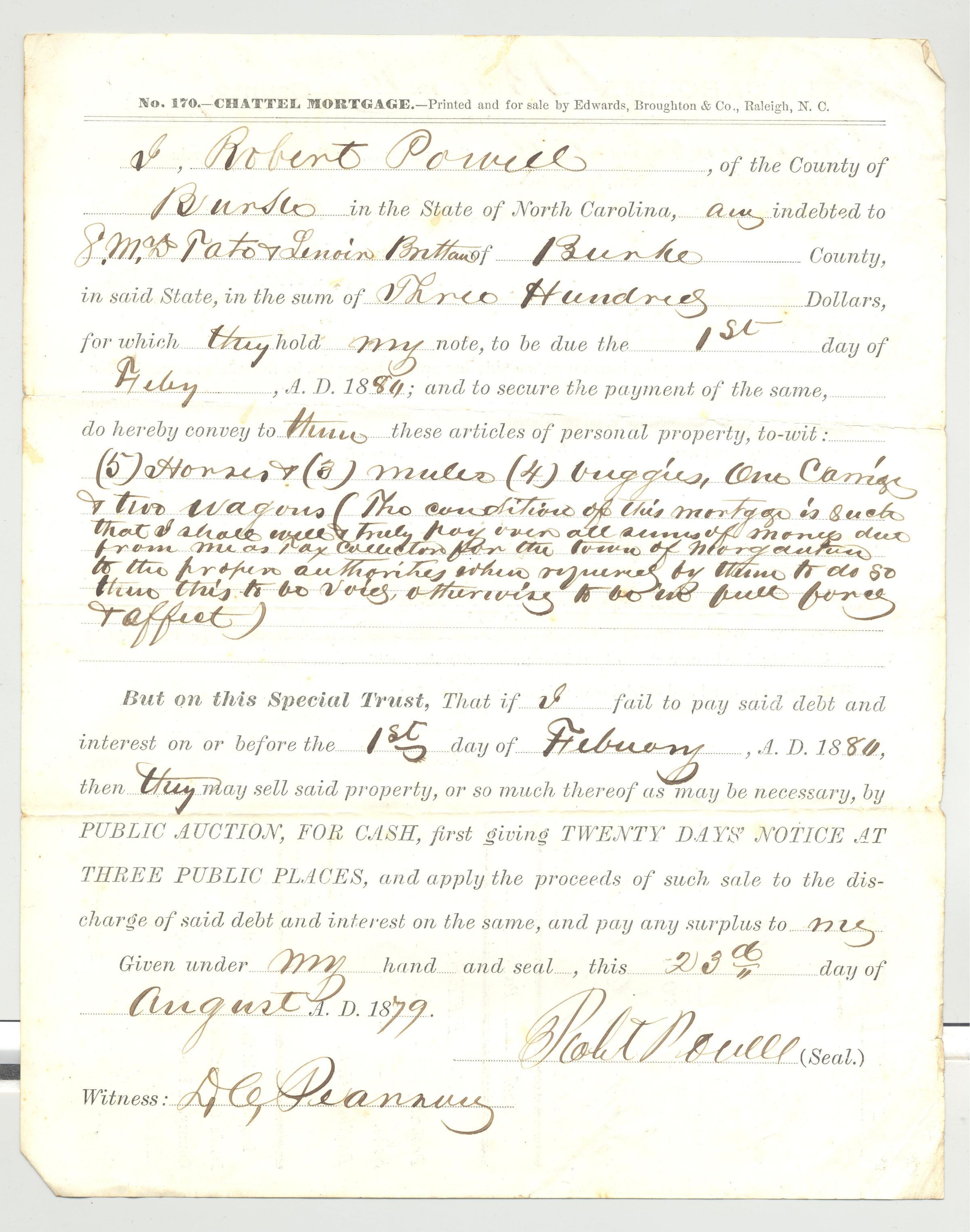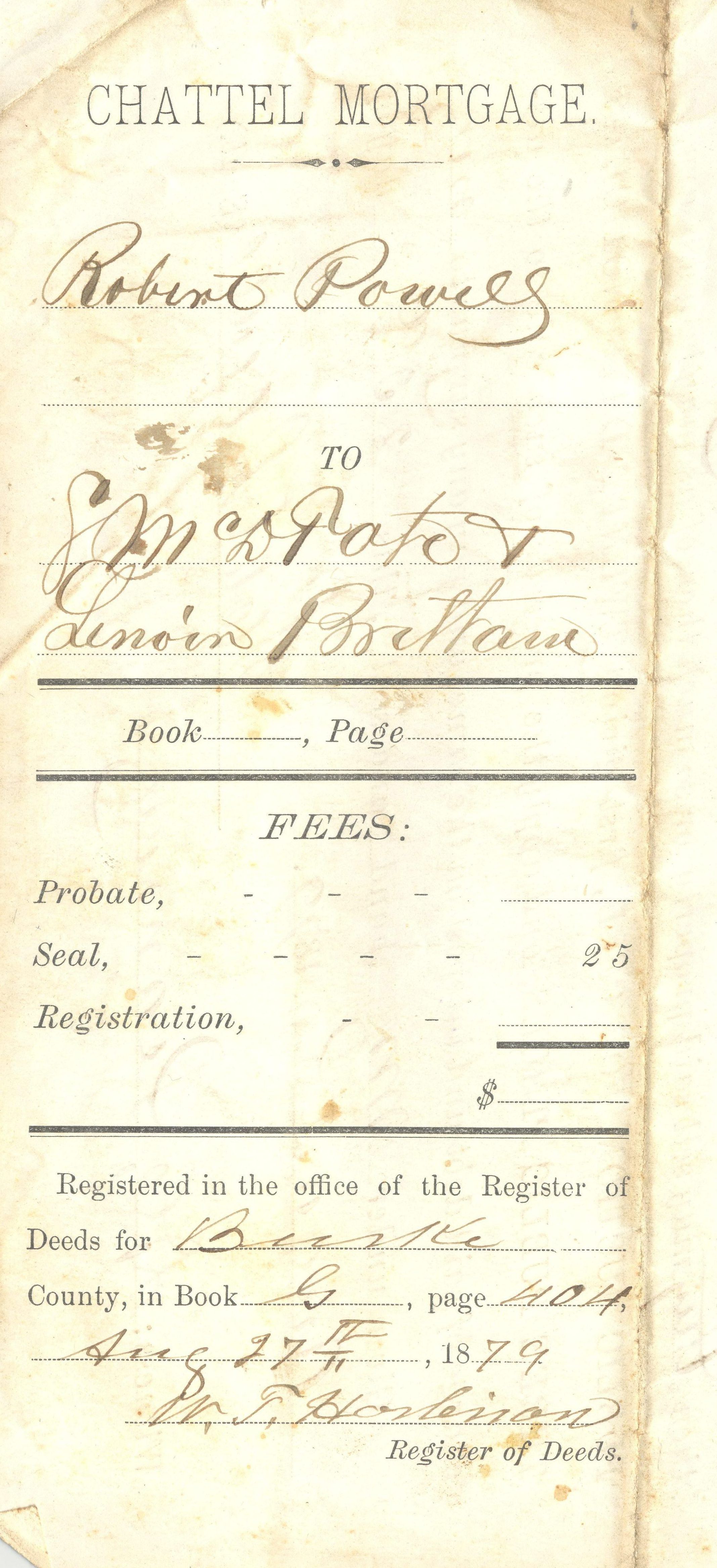 DOC, CHATTEL MORTGAGE, 1879, NC. PERSONAL PROPERTY. 8" X 10"