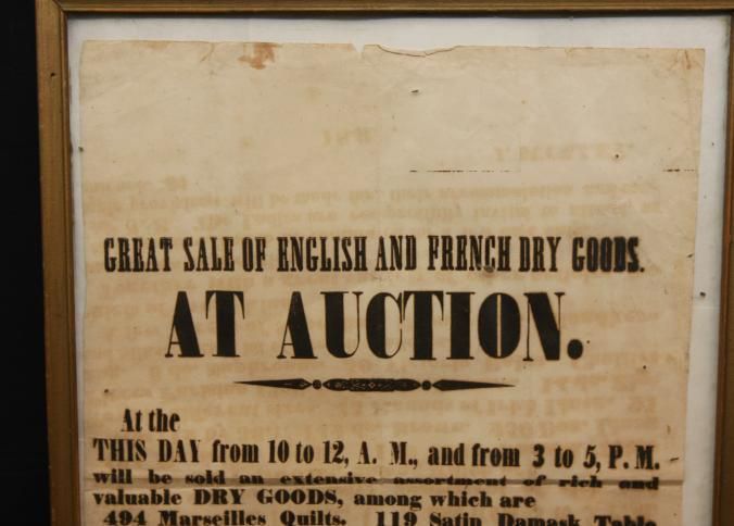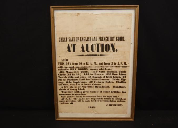 FR. 1843 AMERICAN TRAVELLING AUCTIONEER'S BROADSIDE. 11X14 1/2". FABULOUS AND VERY RARE EARLY AMERICAN ITINERANT AUCTIONEER'S BROADSIDE ON "RAG" PAPER. AUCTIONEER J. BUCKLEY WAS FEATURING A "GREAT SALE OF ENGLISH AND FRENCH DRY GOODS AT AUCTION" OFFERINGCreated By