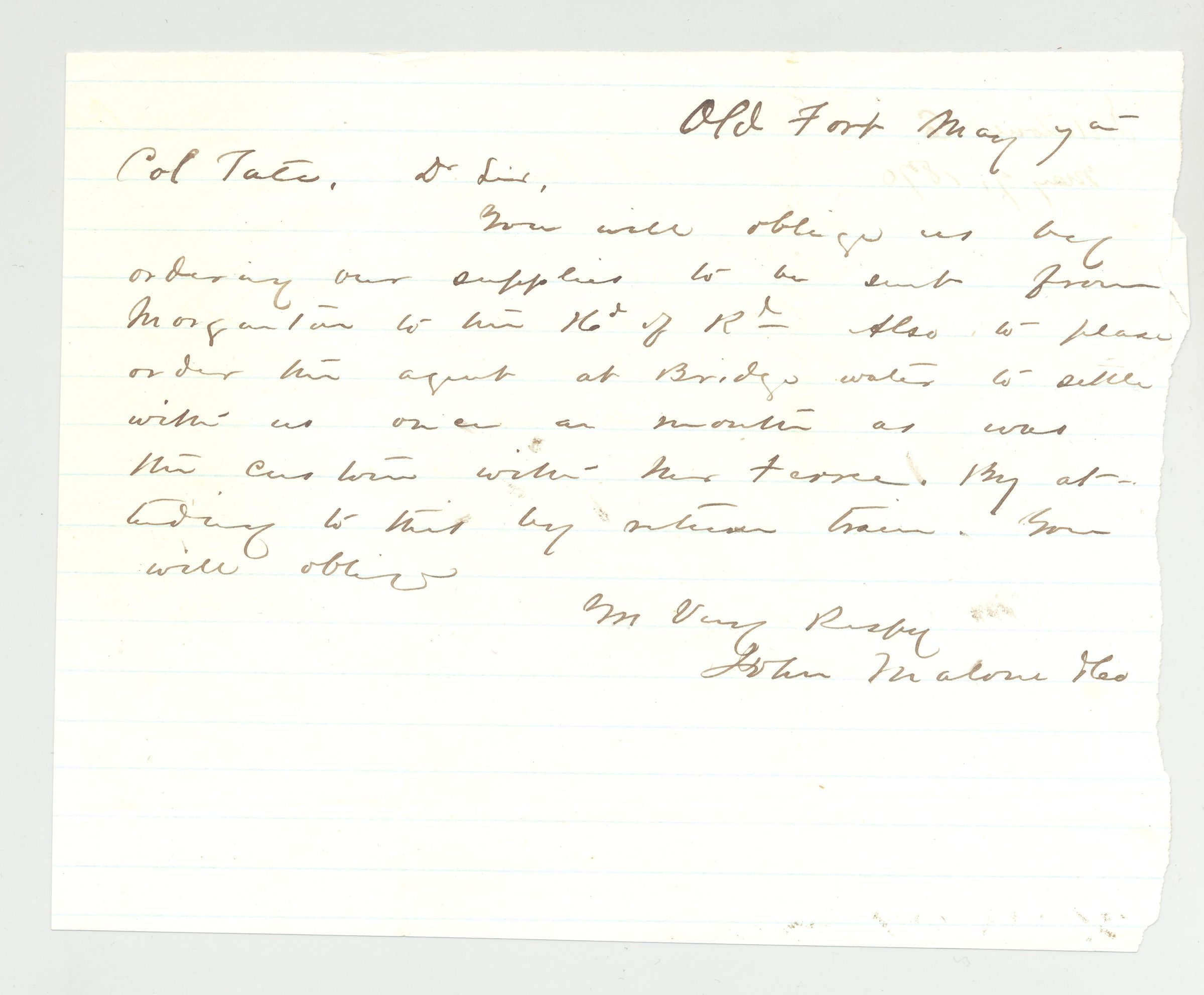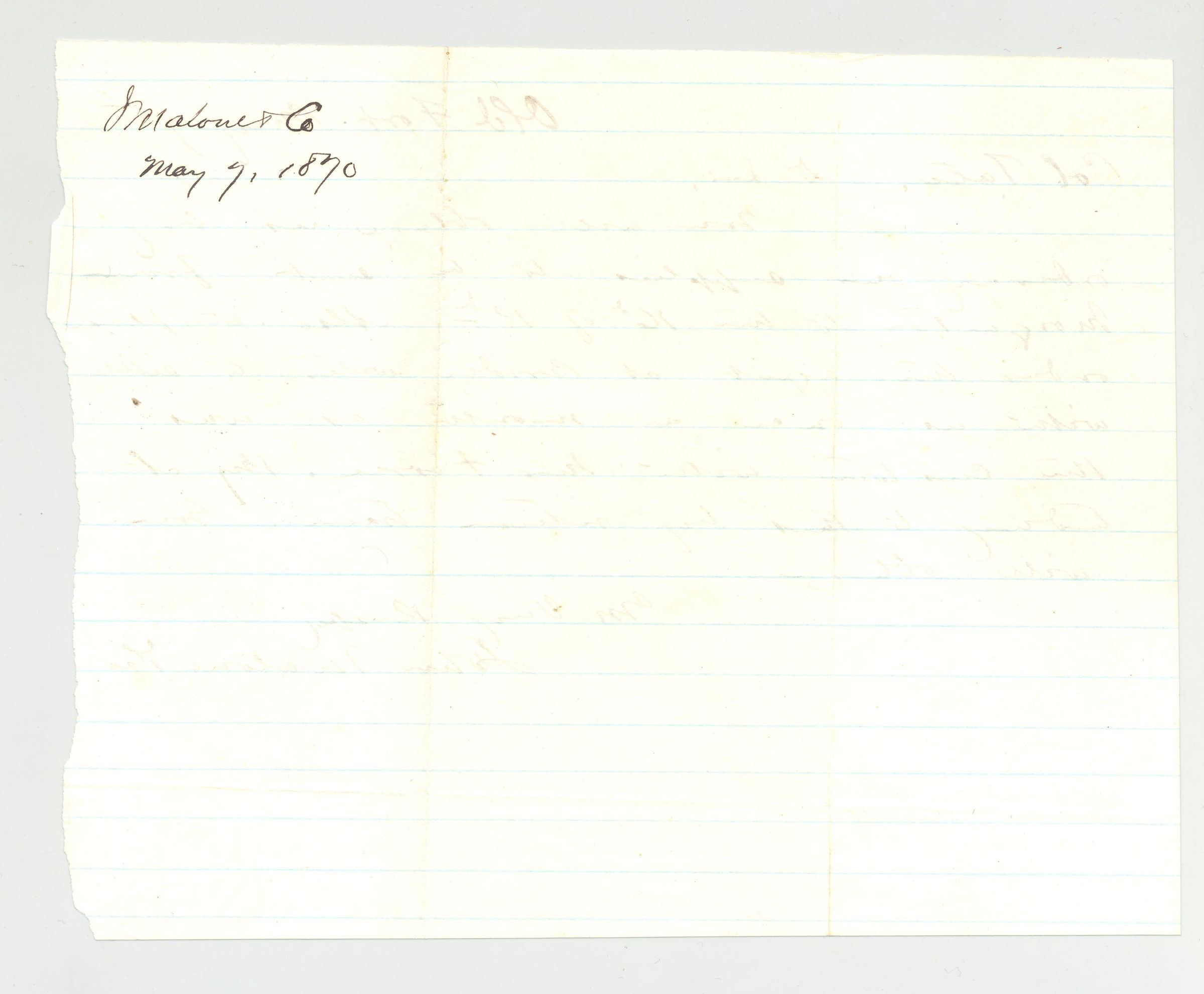 LETTER TO COL. TATE, JOHN MALONE & CO. 1890