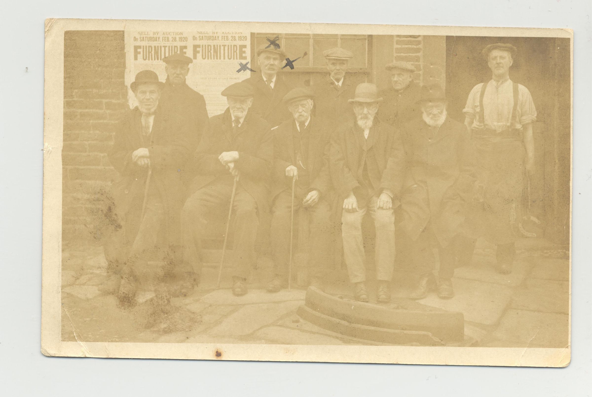 PSTCD, 1920 AUCTION BROADSIDE ON THE WALL BEHIND A LINEUP OF MEN IN PHOTO. "UNCLE CRYER WALTON" IS IDENTIFIED AS STANDING IN THE BACK (AUCTIONEER?)Created By