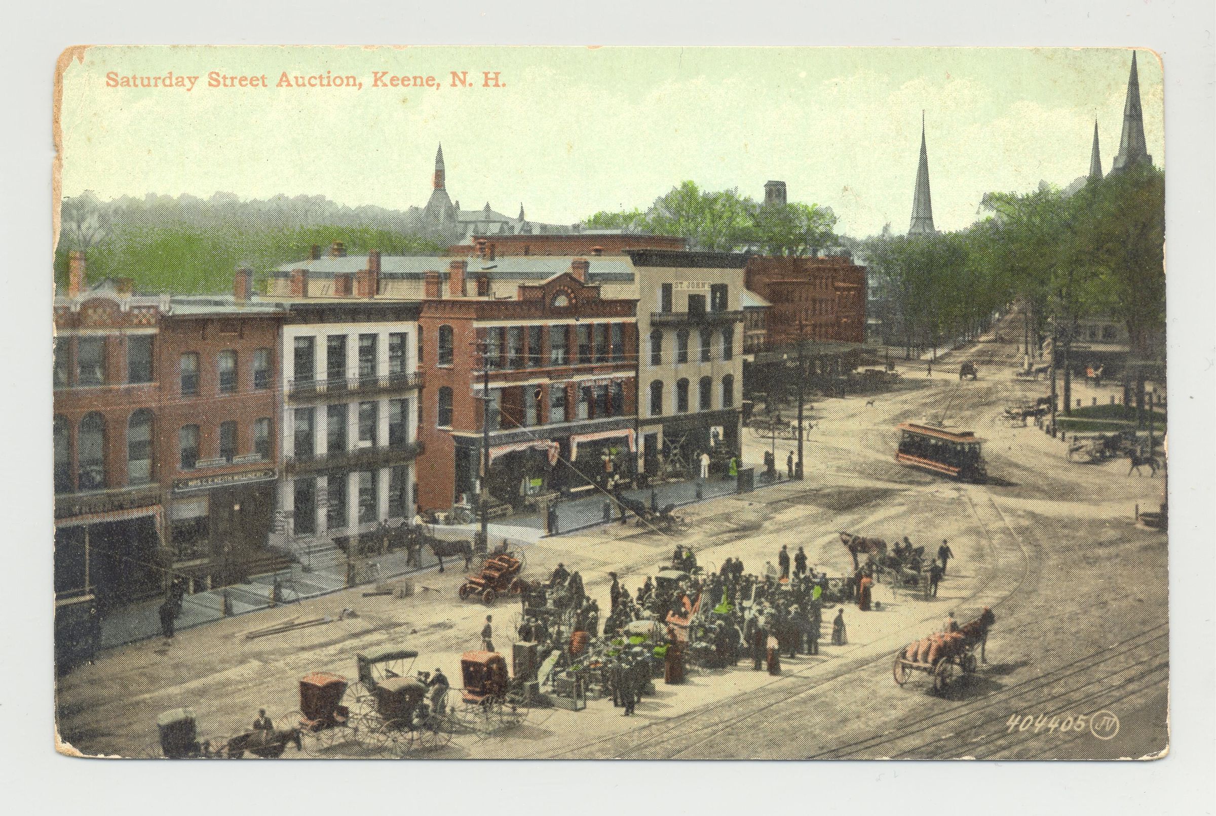PSTCD, "SATURDAY STREET AUCTION, KEEN, NH. FULL COLOR SCENE WITH LARGE CROWD IN THE CENTER OF TOWN WITH WAGONS, EARLY AUTOMOBILES AND TROLLEY.Created By