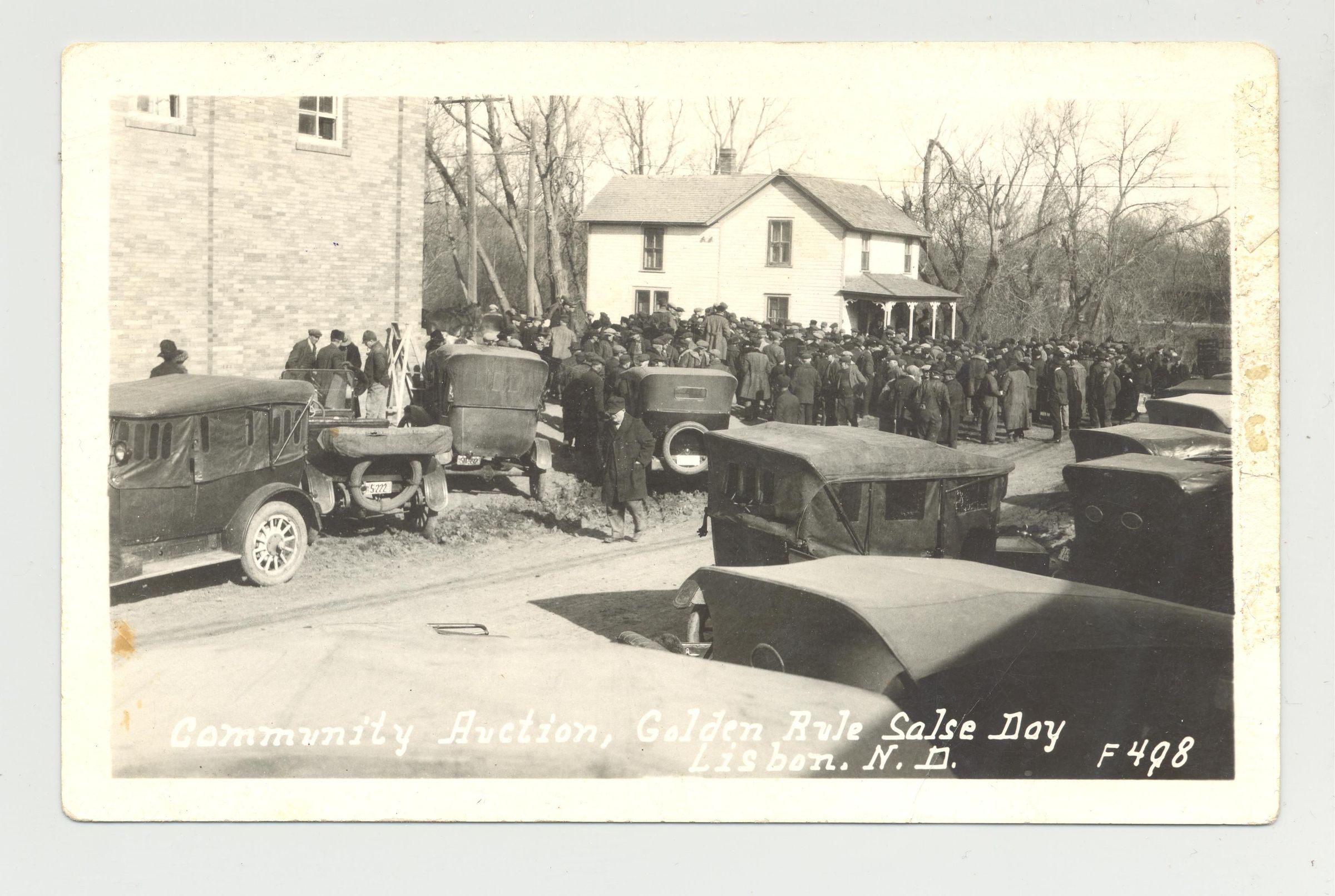PSTCD, "COMMUNITY AUCTION, GOLDEN RULE SALSE DAY, LISBON, N.D." LARGE CROWD AND LOTS OF EARLY VEHICLES.Created By
