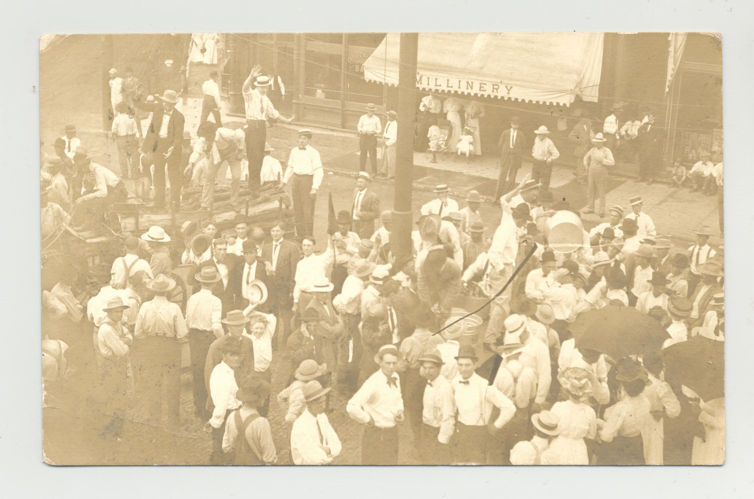 PSTCD, GREAT AUCTION STREET SCENE. THIS MAY BE AN AUCTION SCHOOL POSTCARD AS THE SENDER IS TALKING ABOUT "PRACTICING OUT HERE IN KANSAS." SEVERAL AUCTIONEER'S SELLING AT ONE TIME.Created By